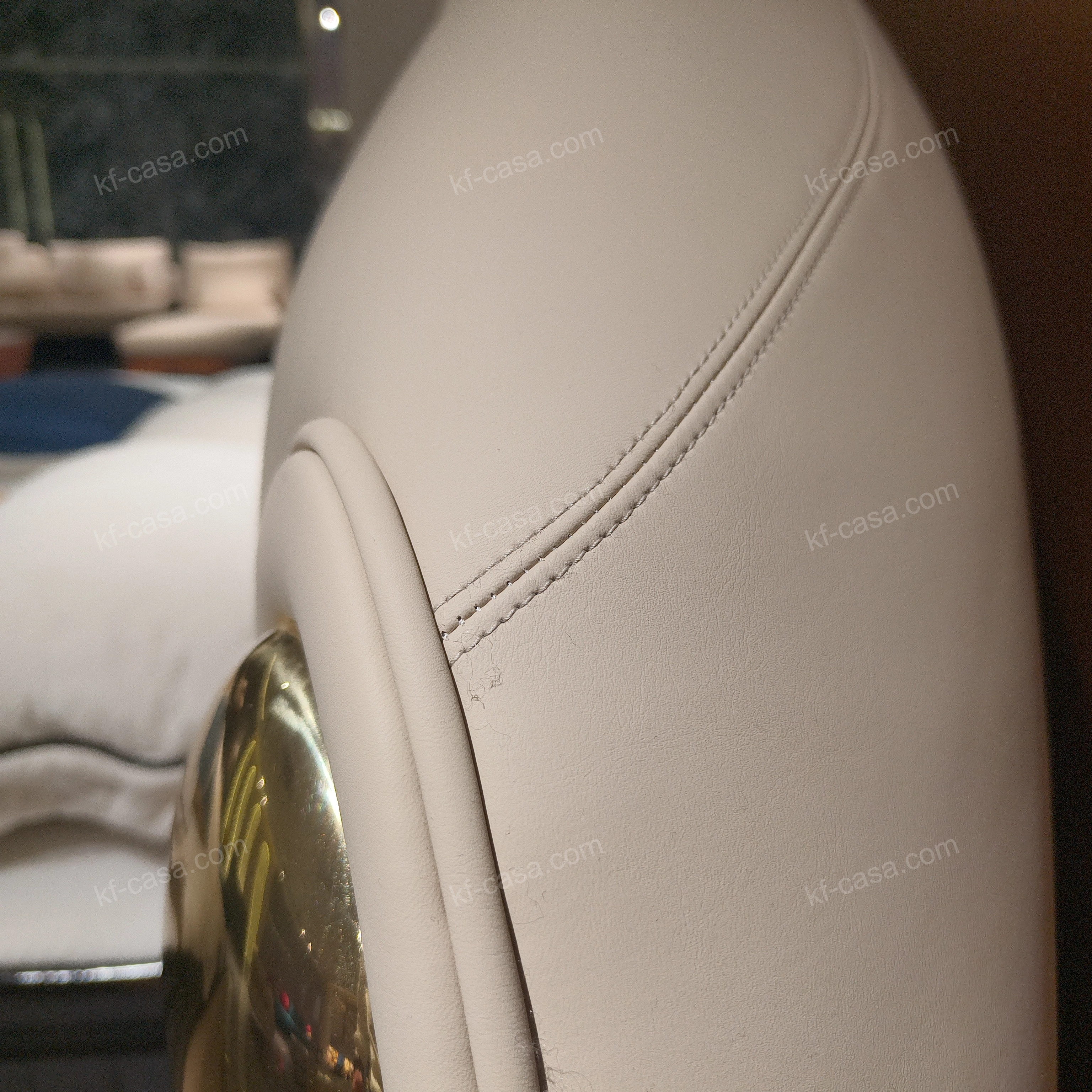 - Premium beige leather upholstery with a soft arched headboard creates a gentle, elegant silhouette