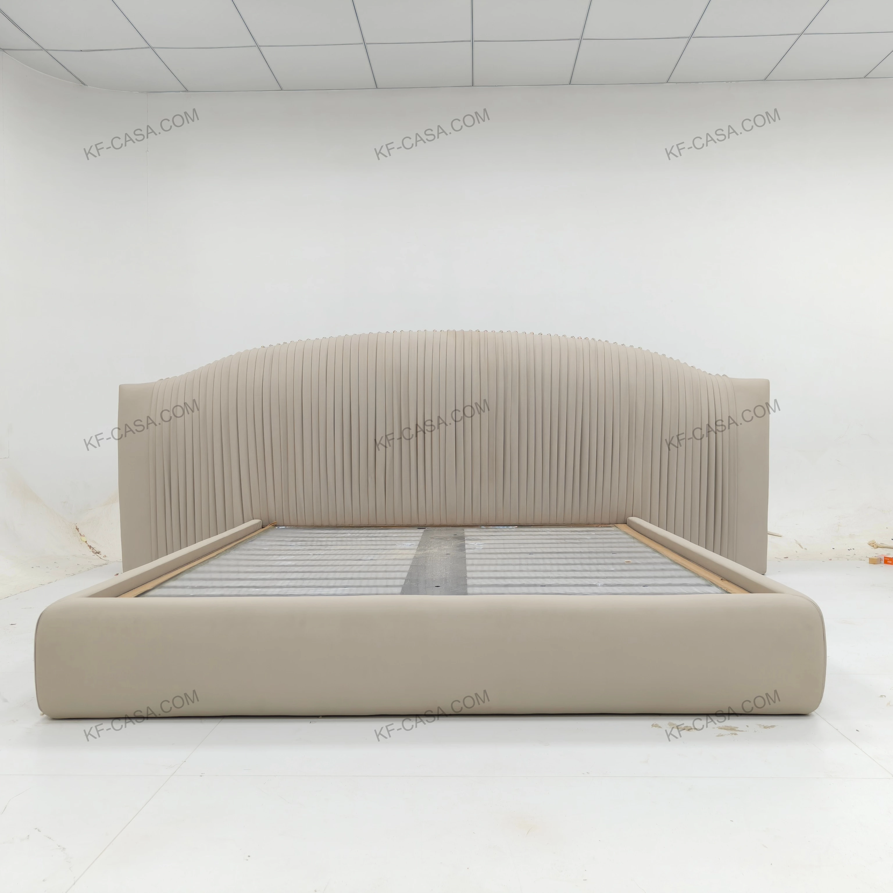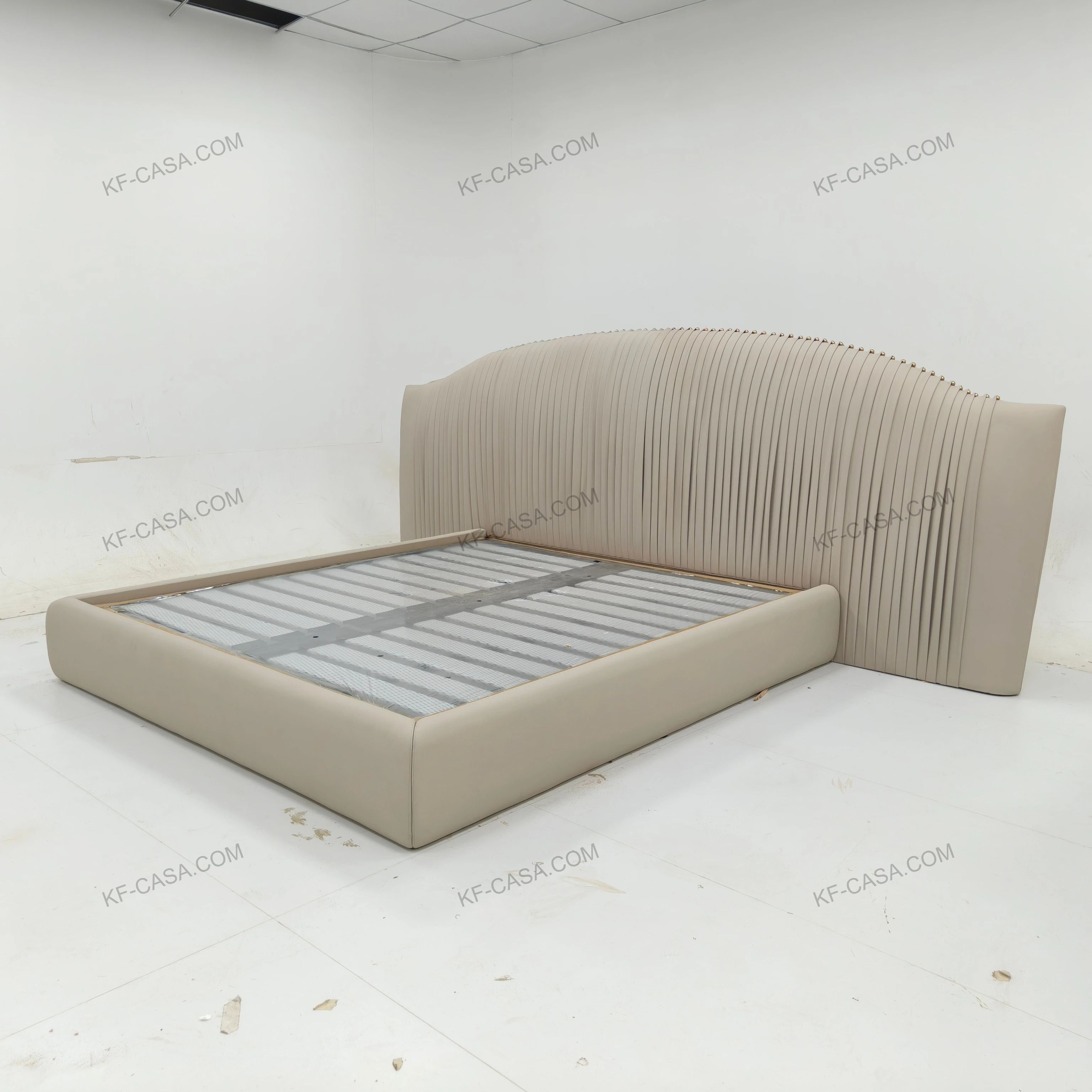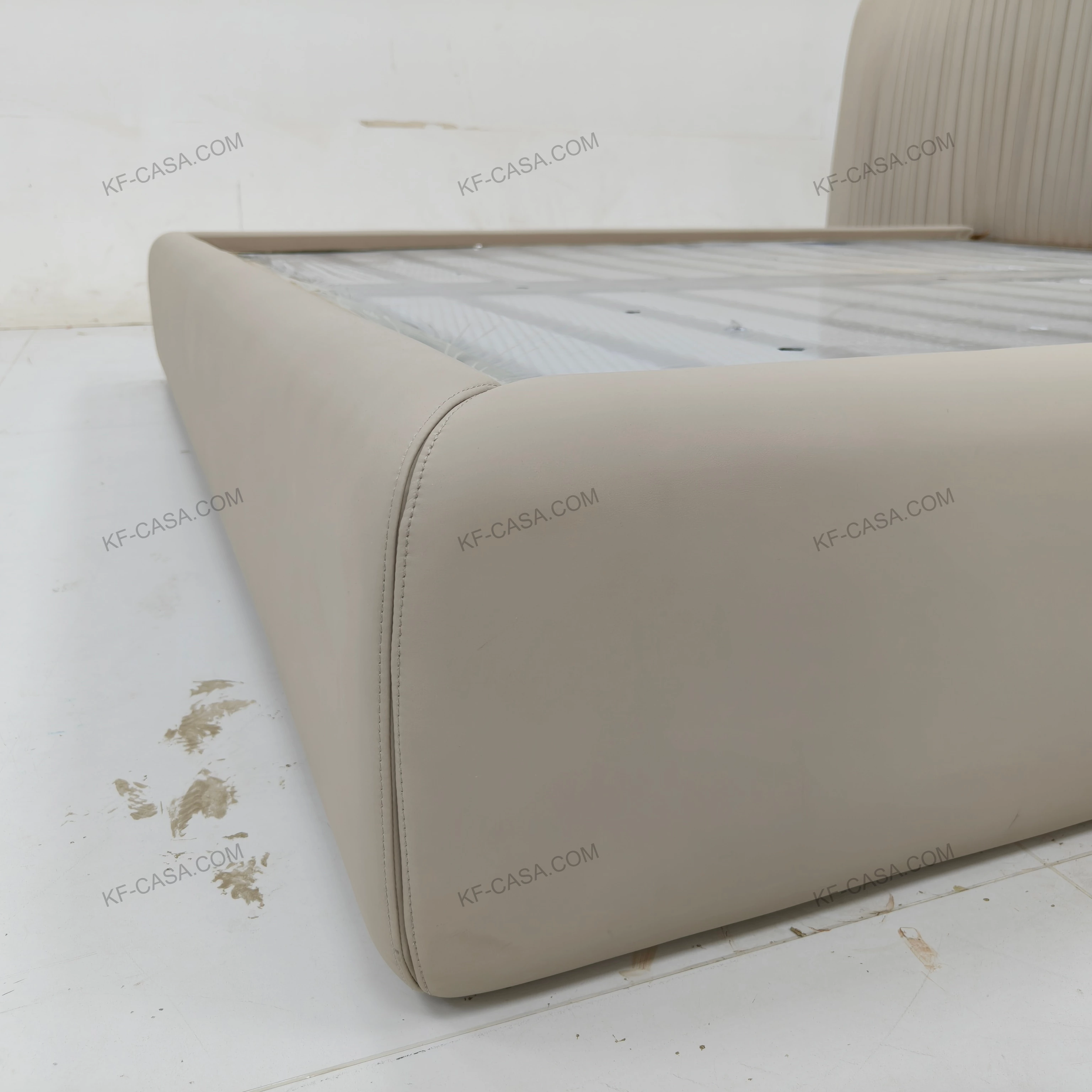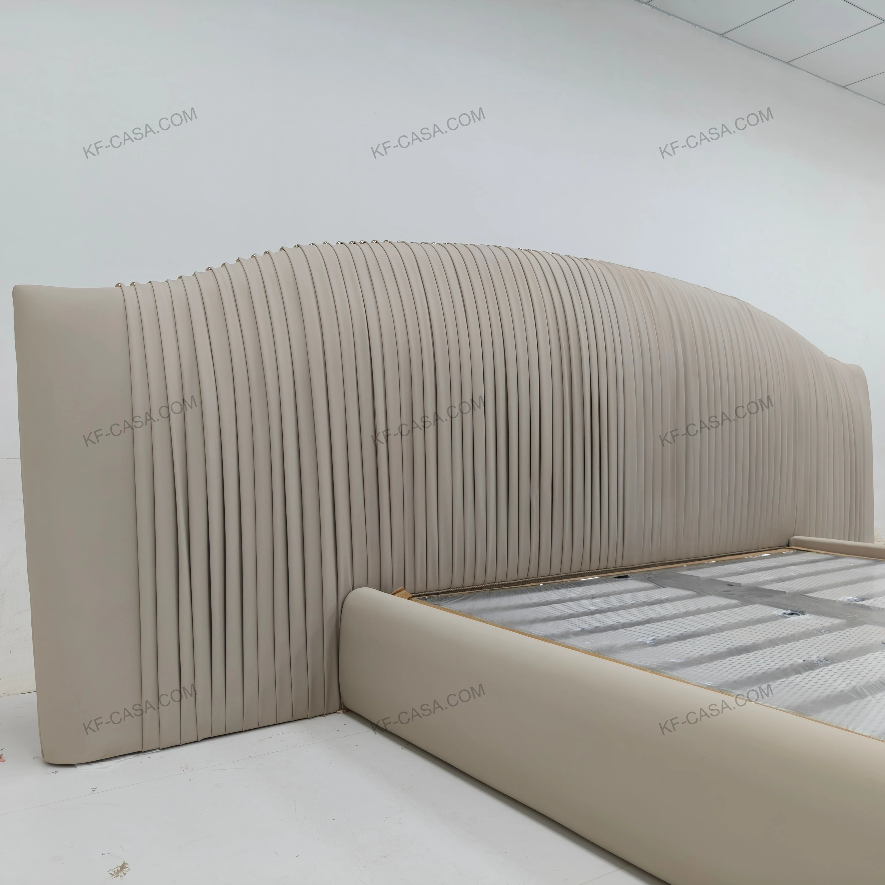 - Premium light beige leather with vertical pleated headboard delivers soft, rhythmic texture