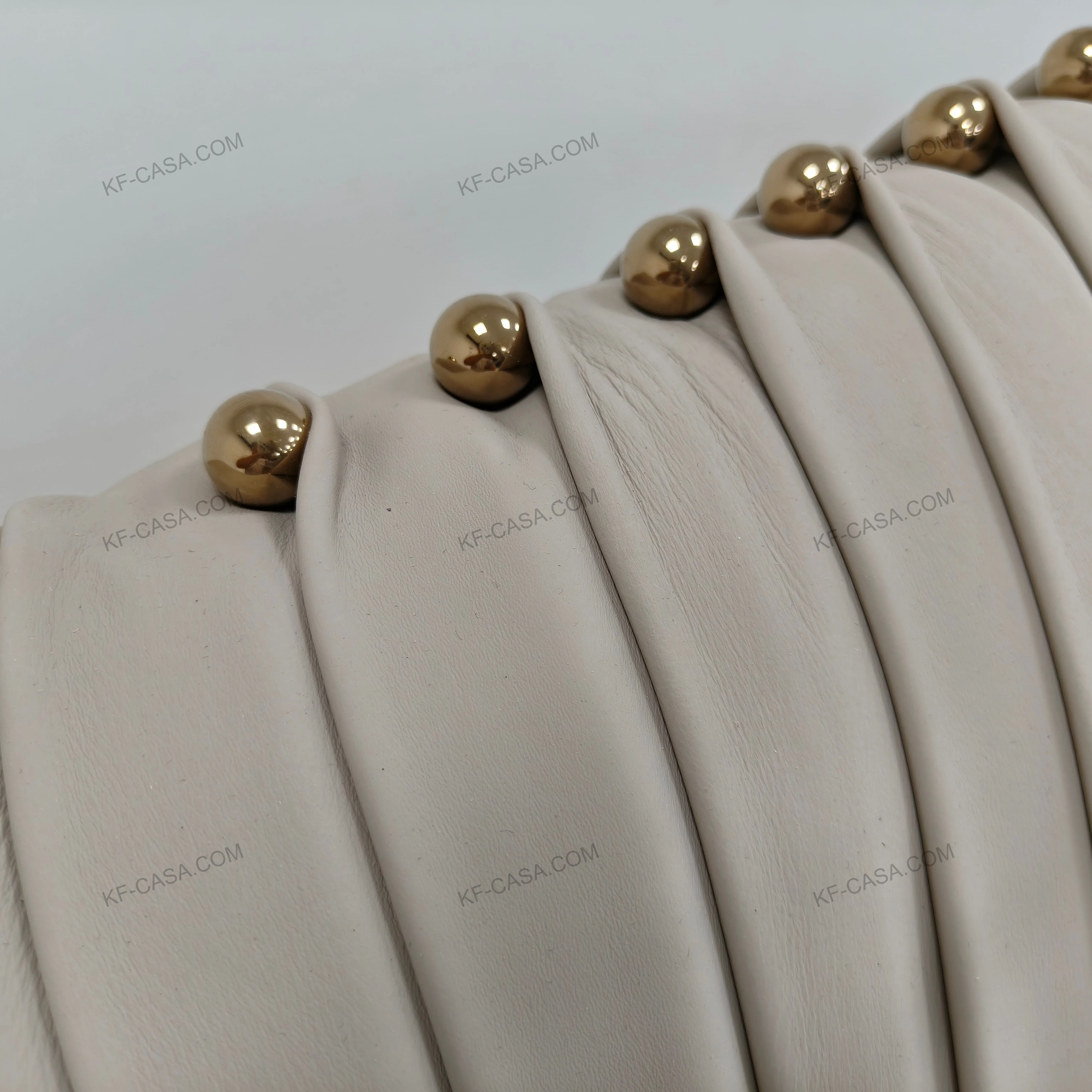 This bed features a vertical pleated light beige leather headboard, accented by gold stainless steel ball studs. Its rounded low-profile frame and precise stitching create a sleek, modern look, while the sturdy slatted base offers reliable support for luxury bedrooms.