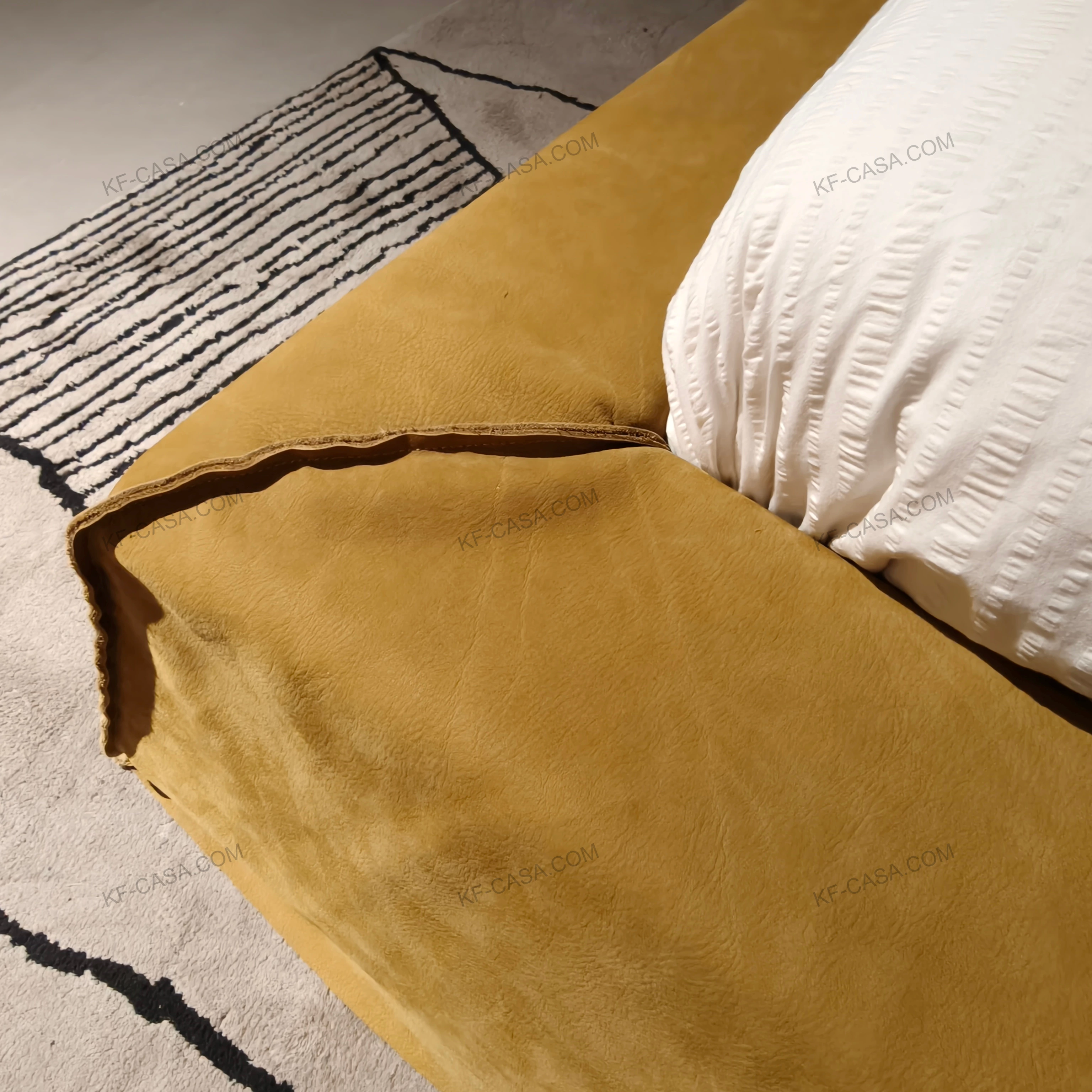 - Premium light beige leather with vertical pleated headboard delivers soft, rhythmic texture