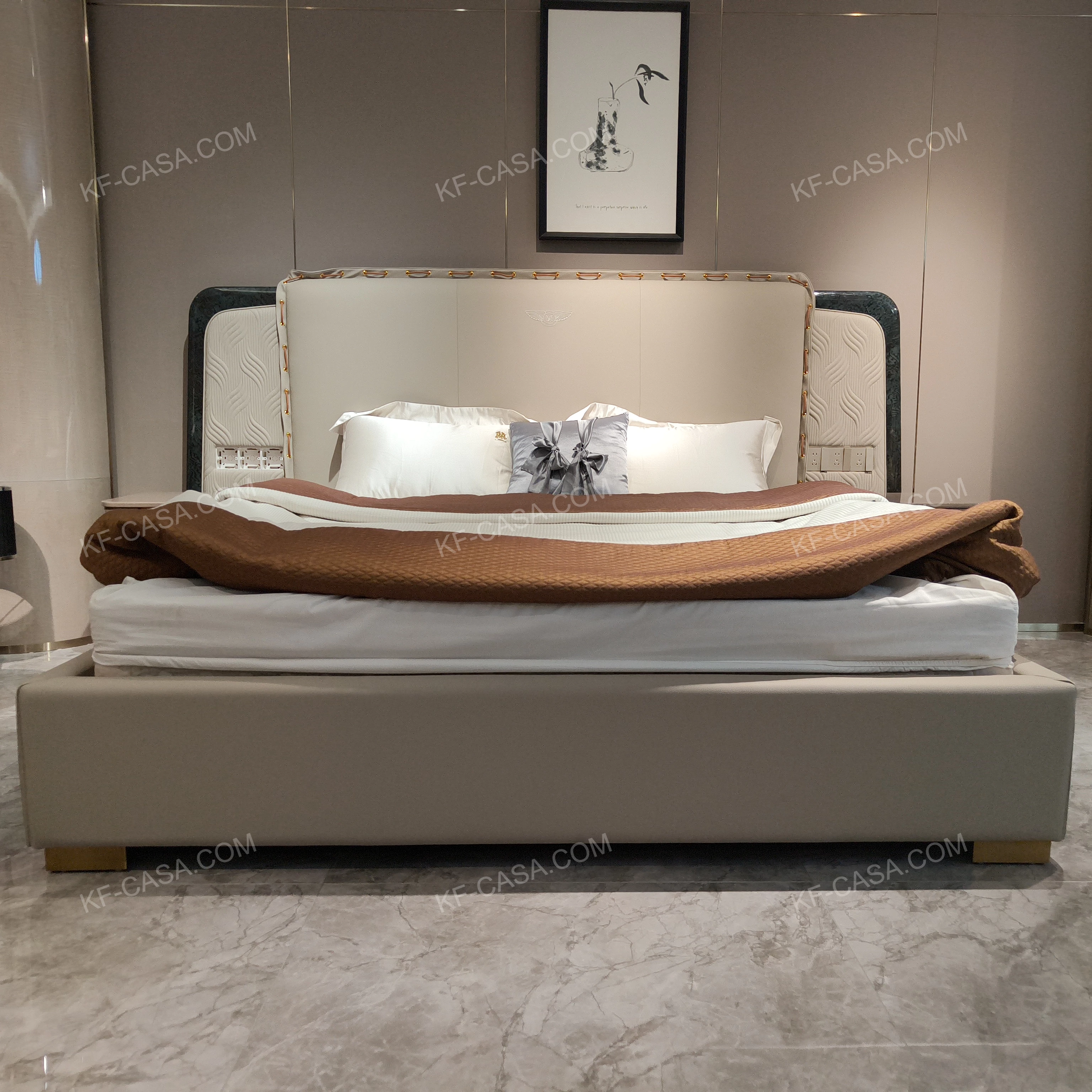 This bed combines soft light beige leather, intricate wave quilting, and striking green marble accents, elevated by braided leather cords and gold stainless steel hardware. Paired with matching side tables, it creates a sophisticated, modern centerpiece for luxury bedrooms.