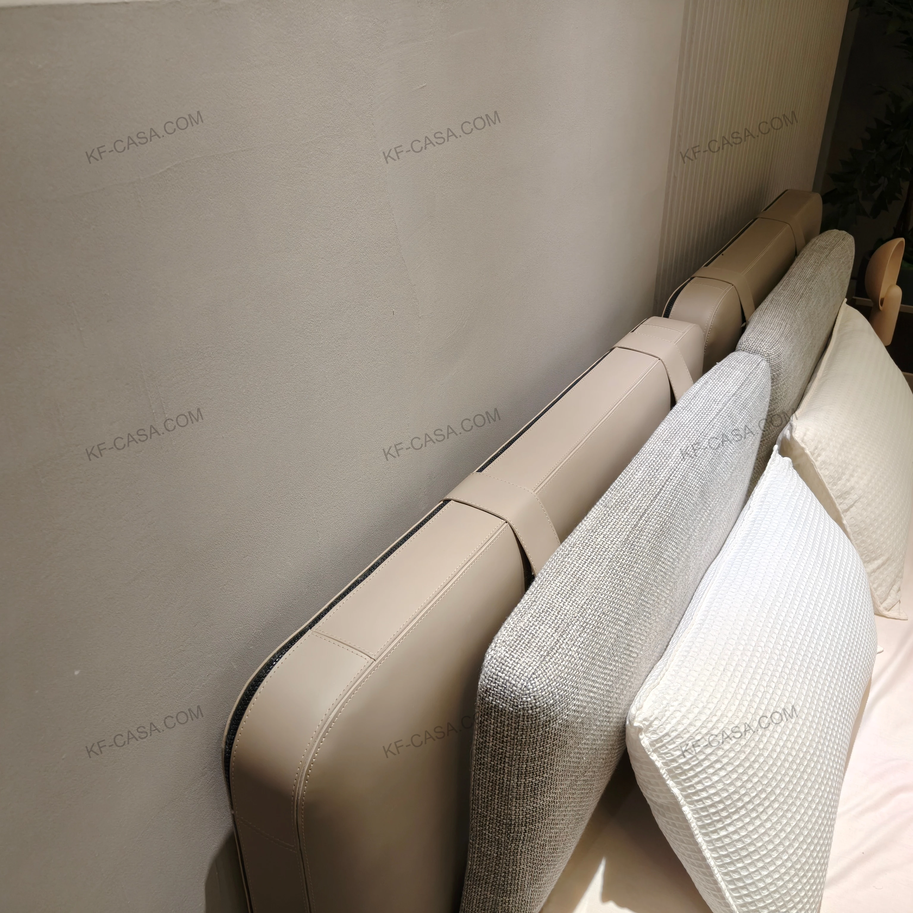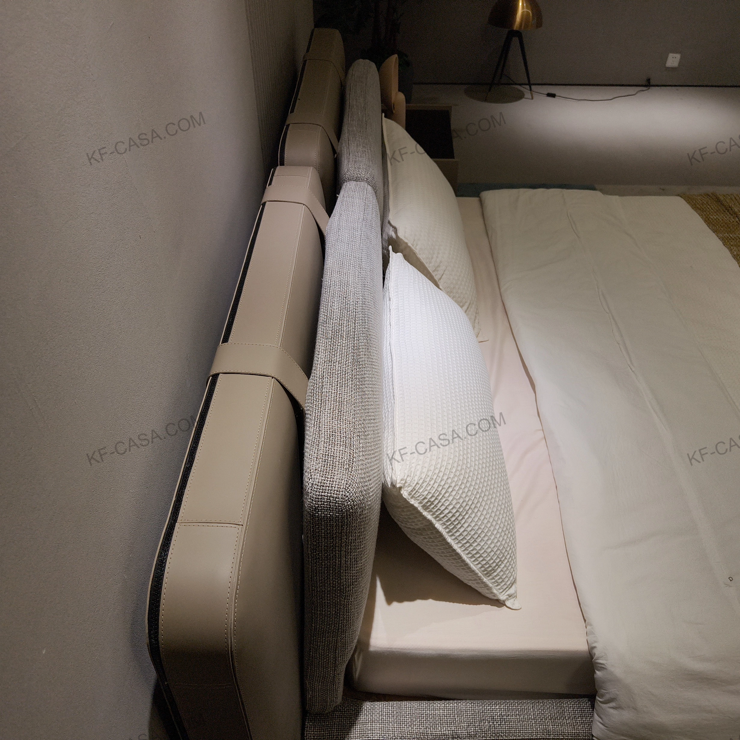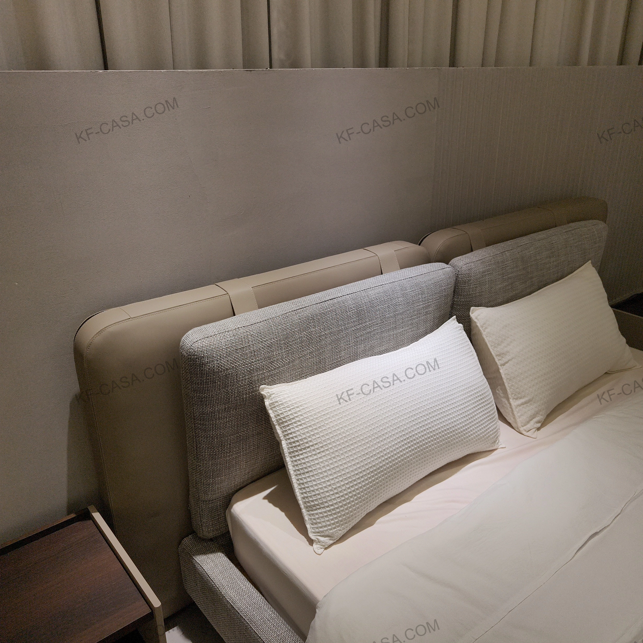 This bed combines beige leather and grey fabric, with a modular padded headboard and low-profile base, bringing refined minimalist luxury to modern bedroom spaces.