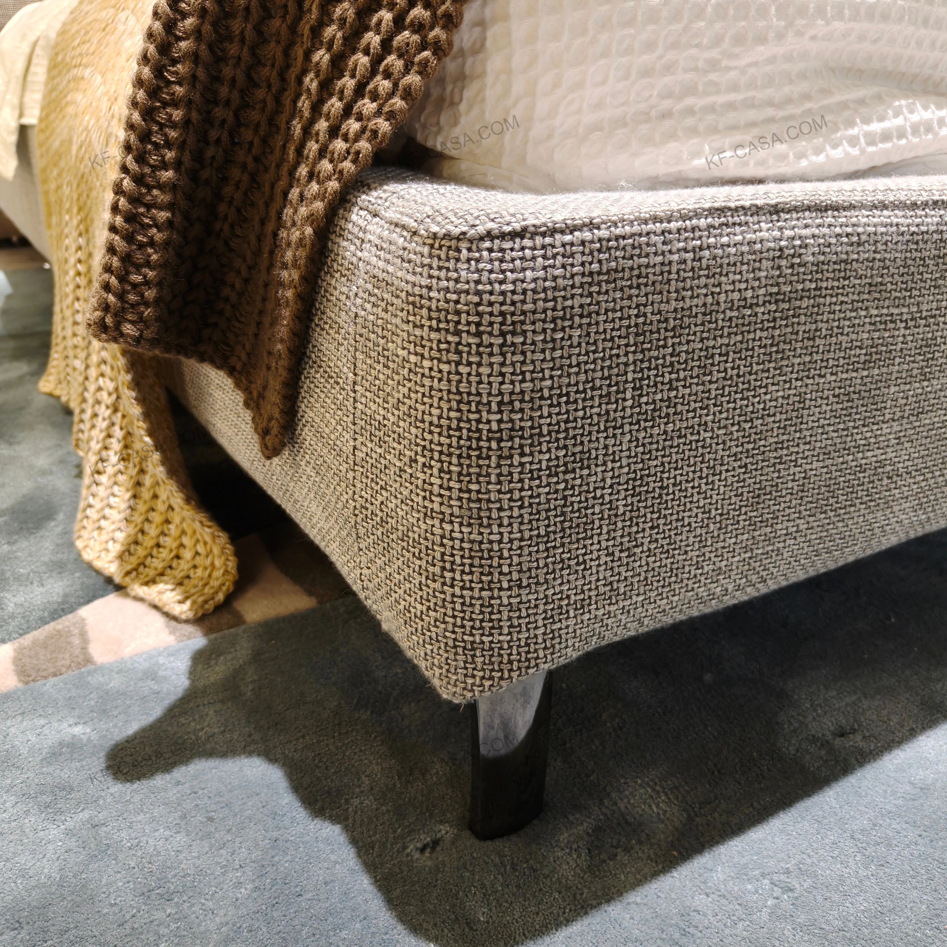 - Low-profile grey fabric base with metal legs ensures sturdy support and a sleek silhouette