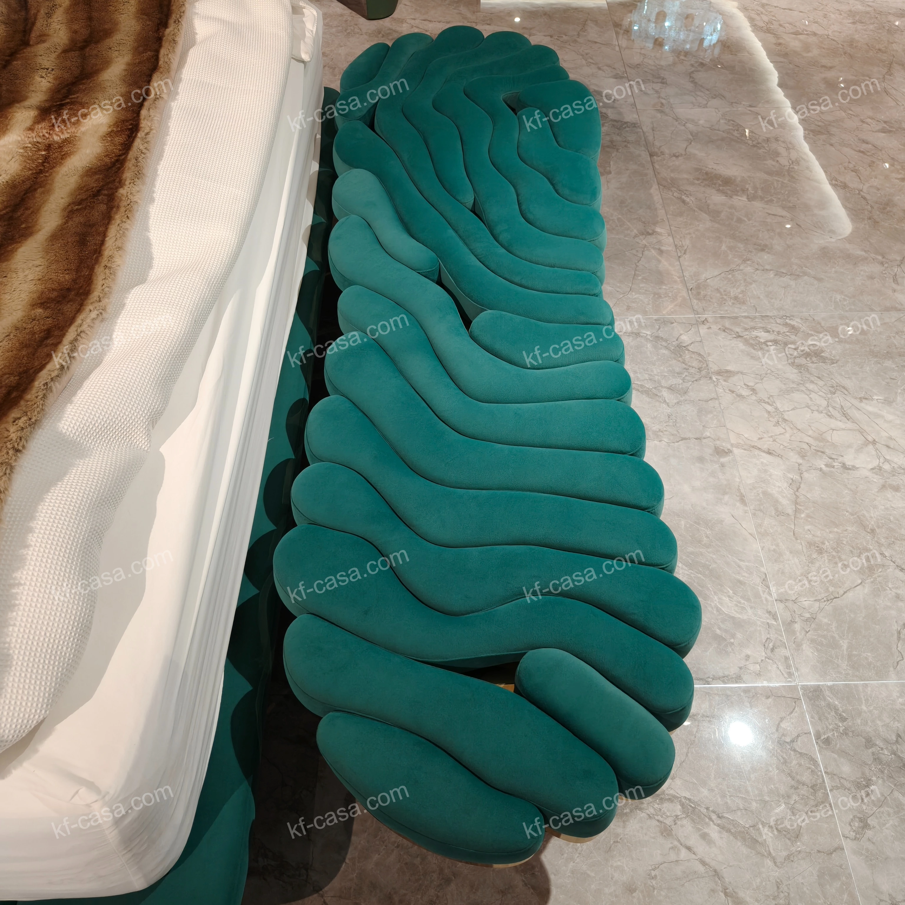 This bed bench features a striking organic wavy silhouette wrapped in premium green velvet, accented by polished gold stainless steel trim that highlights the cushion edges. Its cylindrical velvet-wrapped legs provide stable support while echoing the soft, flowing lines of the design, perfectly complementing the coordinating headboard to create a cohesive, luxurious bedroom aesthetic. It blends artistic form with practical comfort, making it a standout piece for modern upscale interiors.