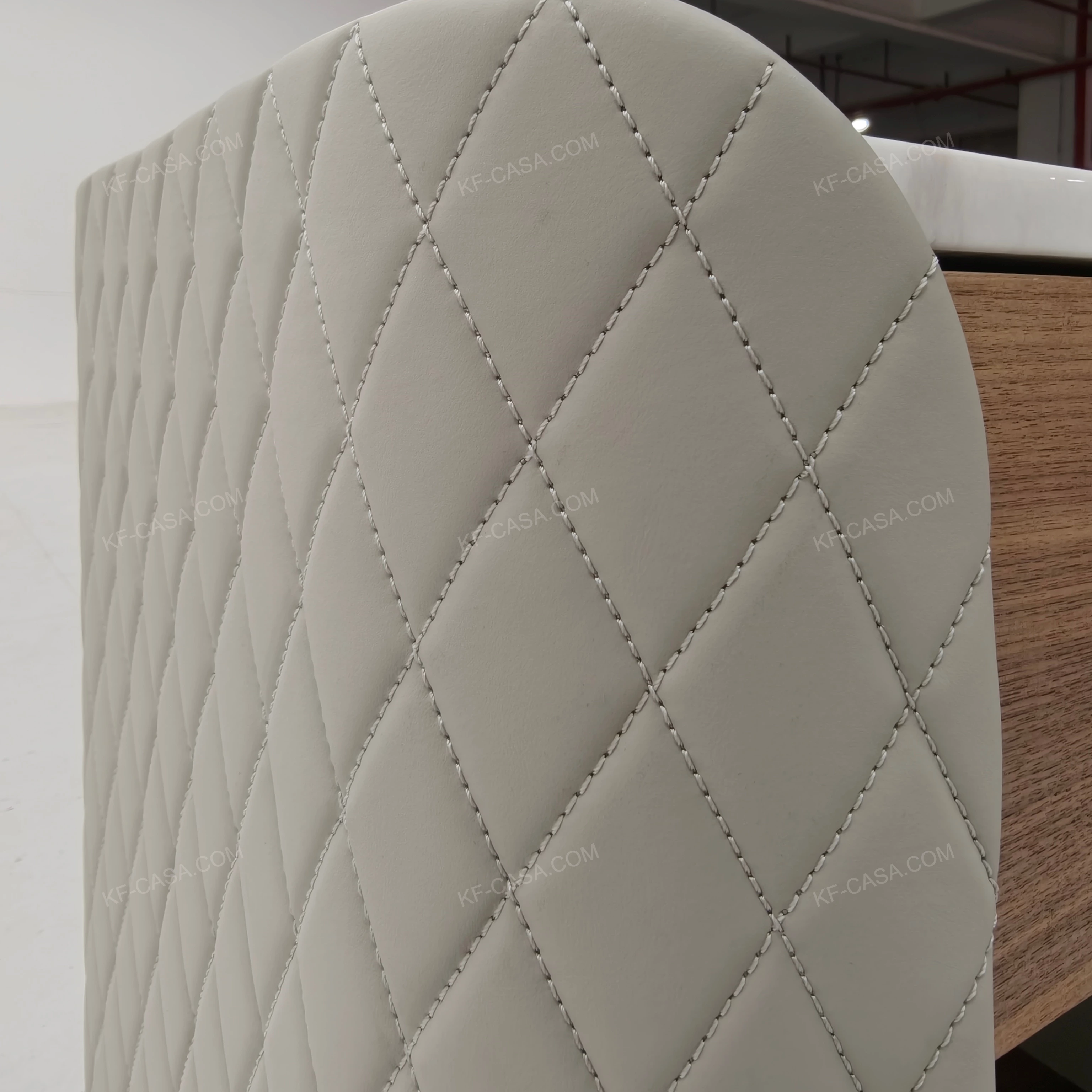 - Light gray quilted leather side panels with diamond stitching, offering soft tactile comfort and refined texture
