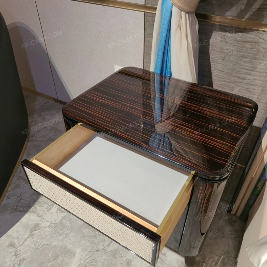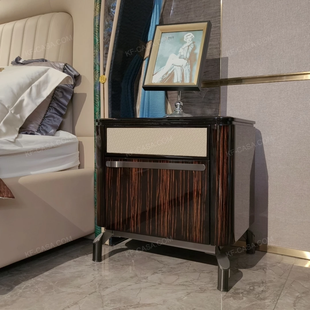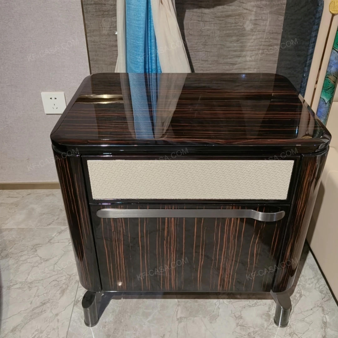 Rooted in high-gloss striped natural wood veneer with striking vertical reddish-brown grain, this nightstand merges organic wood warmth with contemporary luxury. The top drawer boasts a beige woven leather panel and gunmetal stainless steel handle, while the lower cabinet offers generous storage lined with matching natural wood veneer. Supported by sleek gunmetal stainless steel legs and finished with soft velvet drawer lining, it delivers refined elegance and functional comfort for sophisticated bedroom spaces.