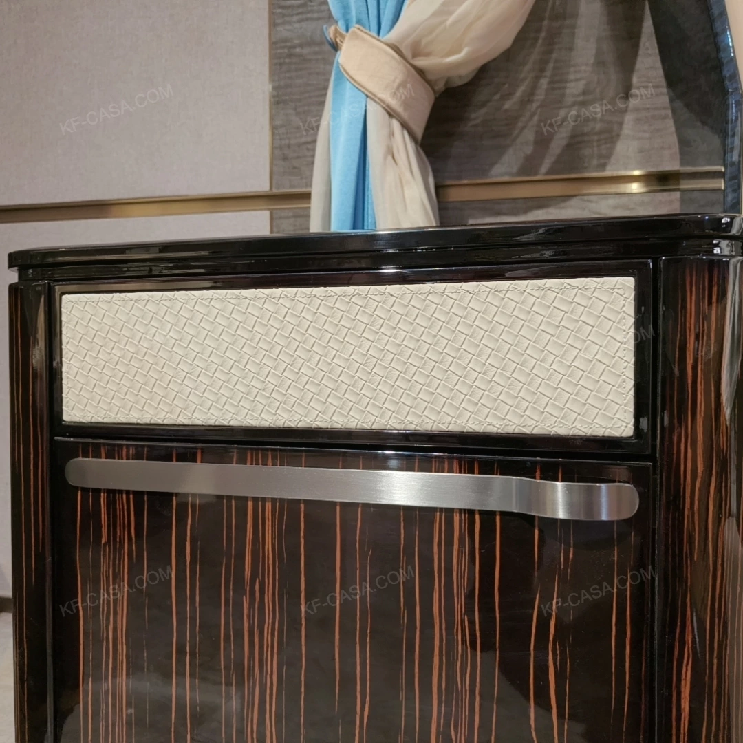 - Top drawer front inlaid with beige woven leather, paired with a gunmetal stainless steel handle for tactile and visual refinement