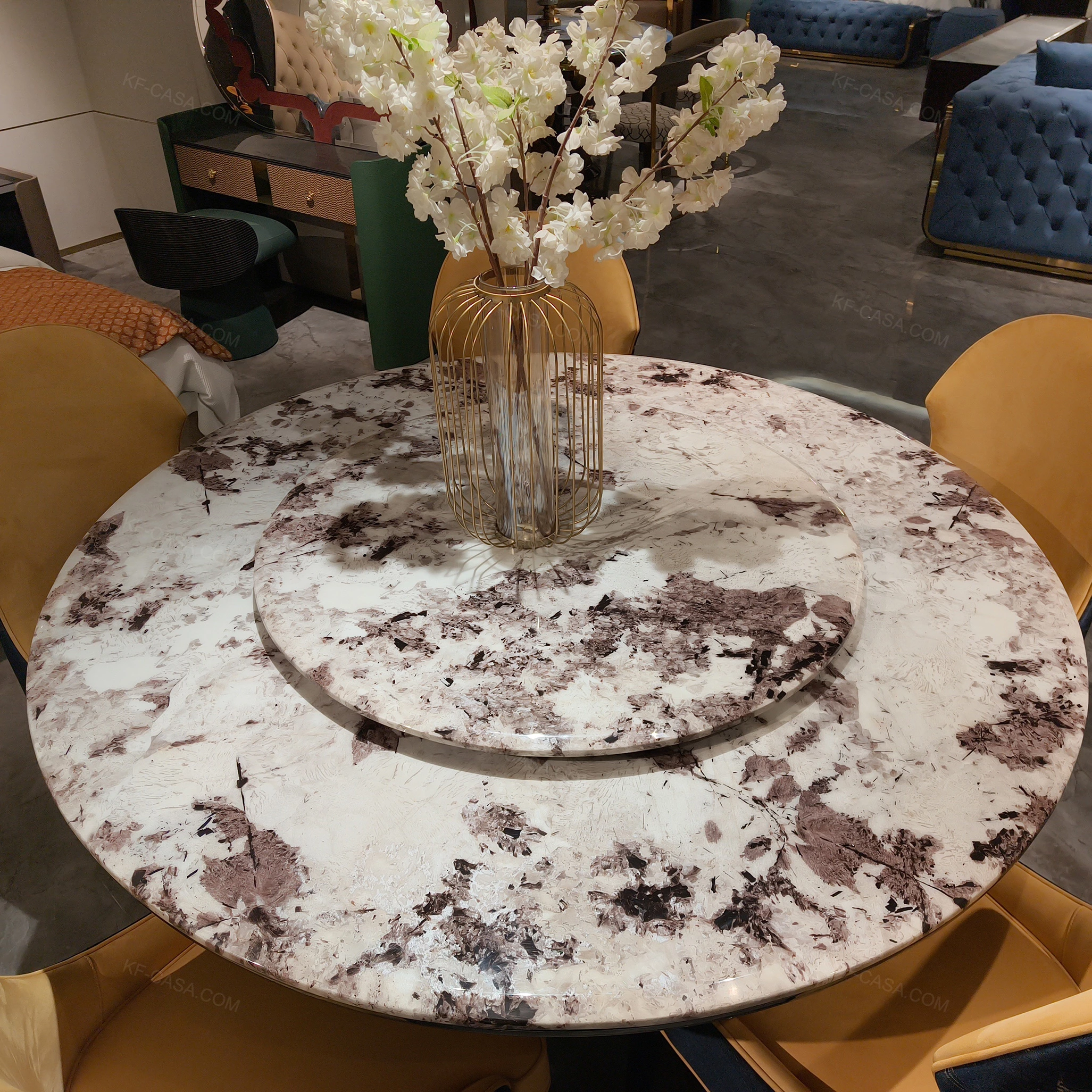 Engineered with meticulous factory craftsmanship, this round dining table features a hand-selected white marble top with one-of-a-kind purple veining, paired with a matching lazy Susan for functional elegance. Its tri-pillar base combines natural wood veneer, black ribbed detailing, and gold stainless steel to deliver both structural stability and visual depth. Coordinating chairs, crafted from premium blue embroidered fabric and mustard leather, complete the set, offering a durable, luxurious solution for upscale dining spaces.