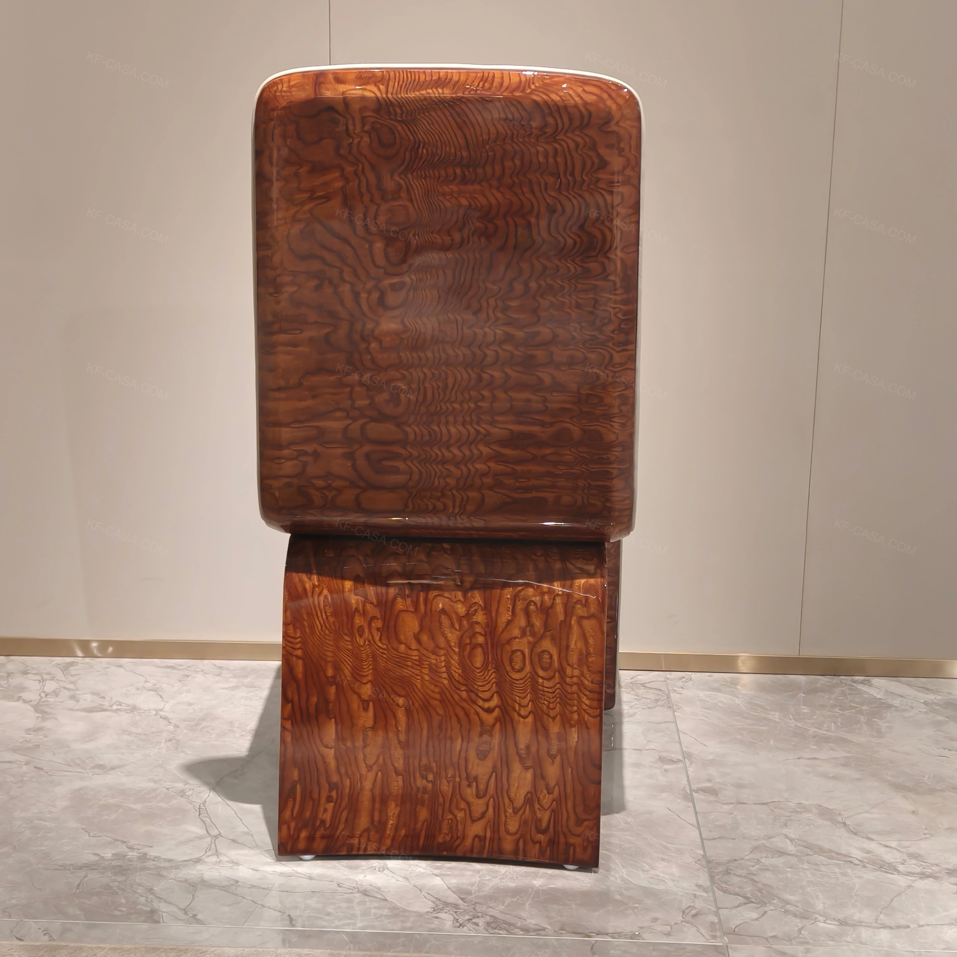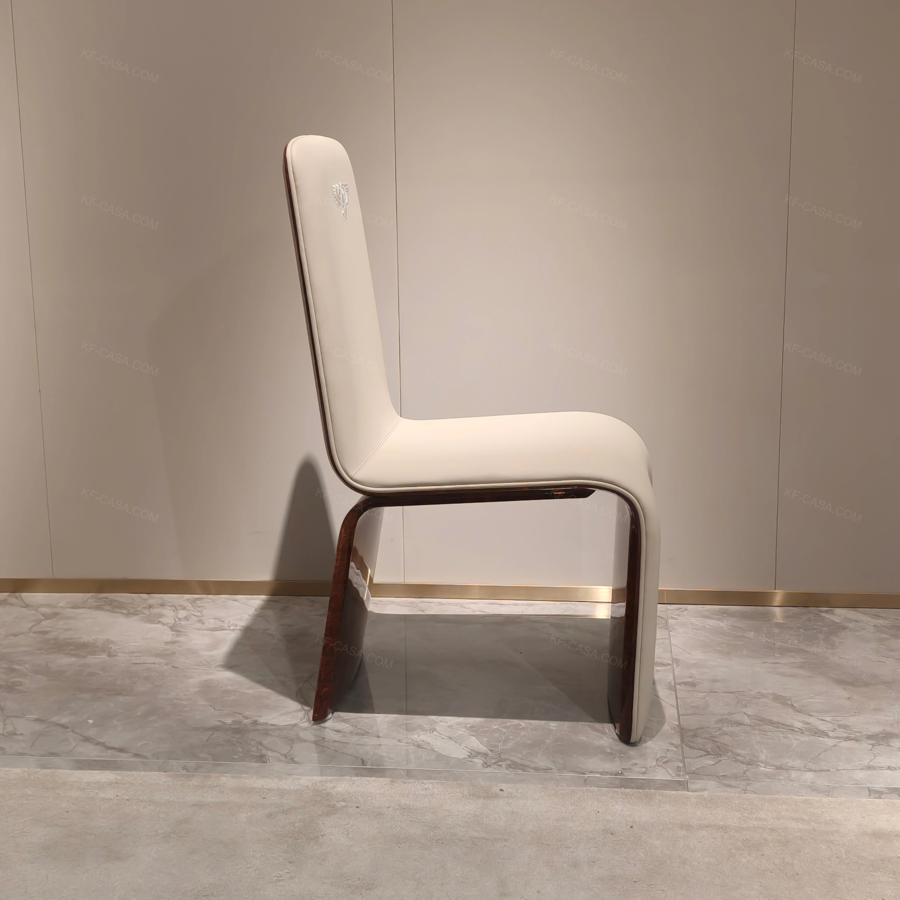 Anchored in sleek, sculptural design, this dining chair features premium white leather upholstery adorned with an embossed wing emblem, offering a soft, luxurious seating experience. Its cantilever frame is crafted from high-gloss natural wood veneer, highlighting intricate wavy grain patterns that add organic warmth to the modern silhouette. Available in two refined finishes, it balances ergonomic comfort with timeless luxury, making it an ideal accent for upscale contemporary dining interiors.