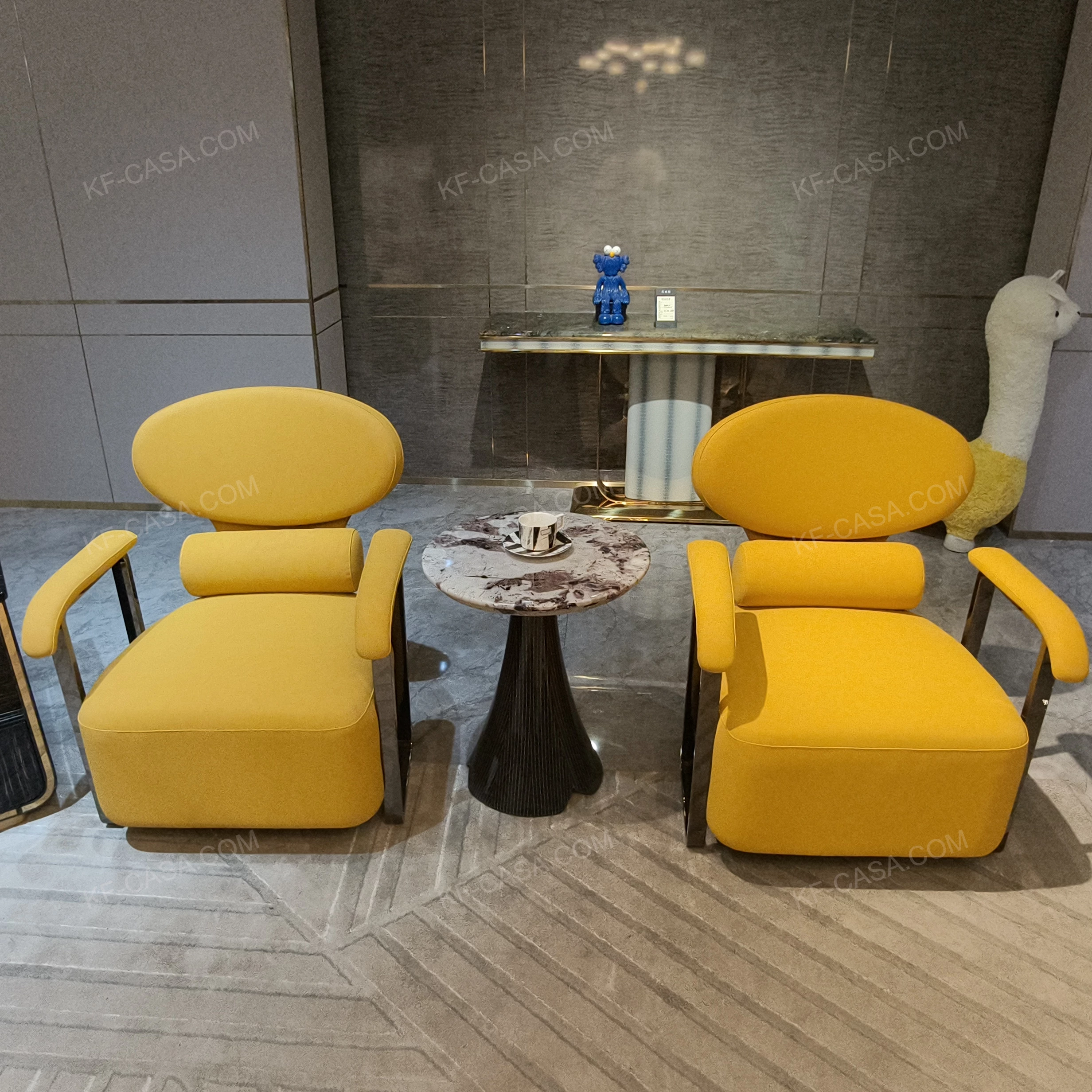 Blending classic luxury with modern comfort, this sofa collection pairs beige tufted leather sofas with vibrant yellow velvet accent chairs. The sofas showcase intricate tufting and elegant dark decorative panels with gold stainless steel trim, while the accent chairs deliver ergonomic support via sleek stainless steel frames. Its modular design enables flexible placement, creating a sophisticated centerpiece for upscale living spaces.