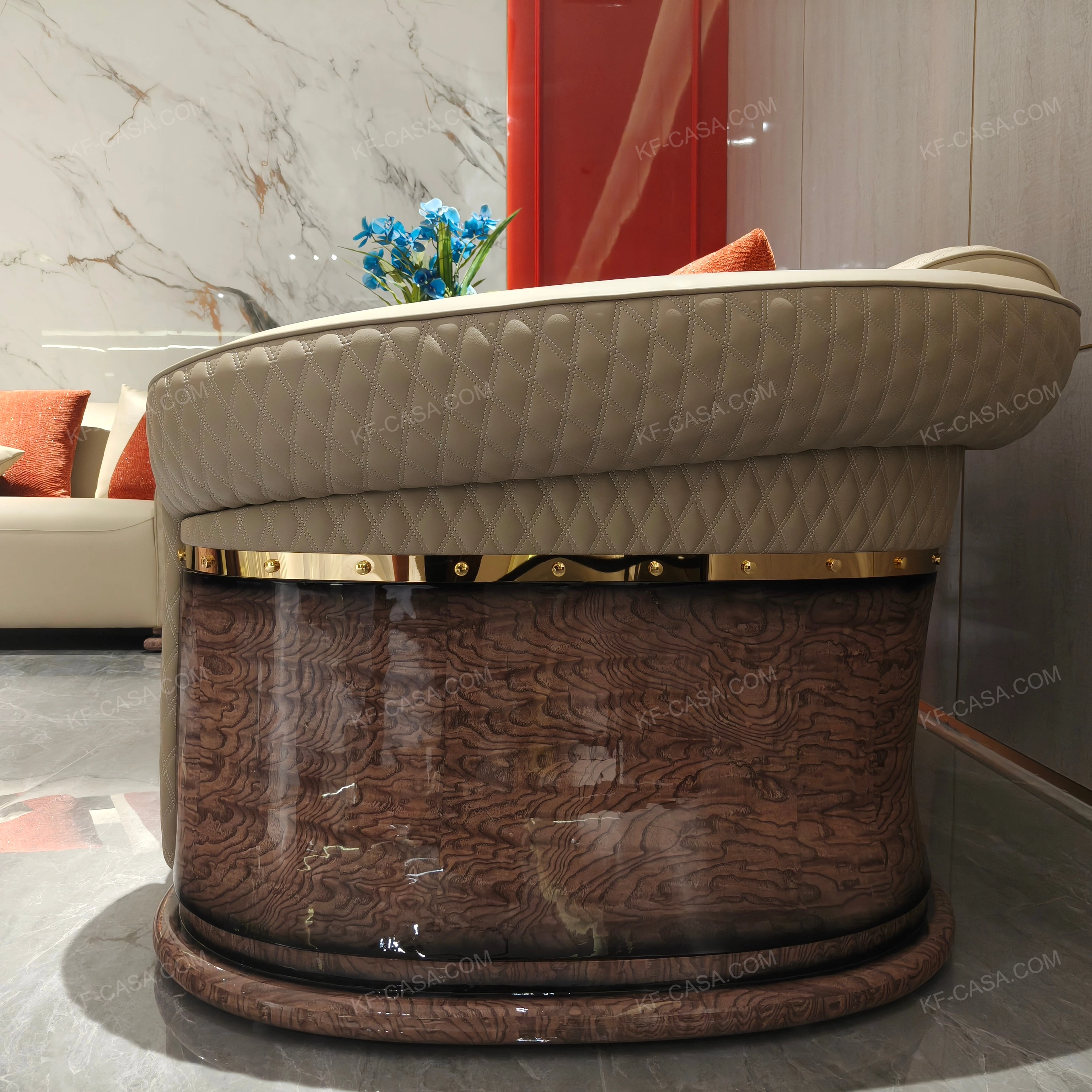 This curved luxury sofa set features a fluid ergonomic silhouette, highlighted by exquisite diamond grid quilted craftsmanship, high-gloss natural burl wood veneer accents and polished gold stainless steel decorative details. Vibrant contrast cushions add visual vitality, while the complete matching ensemble forms a cohesive, upscale seating solution tailored for modern luxury living spaces.