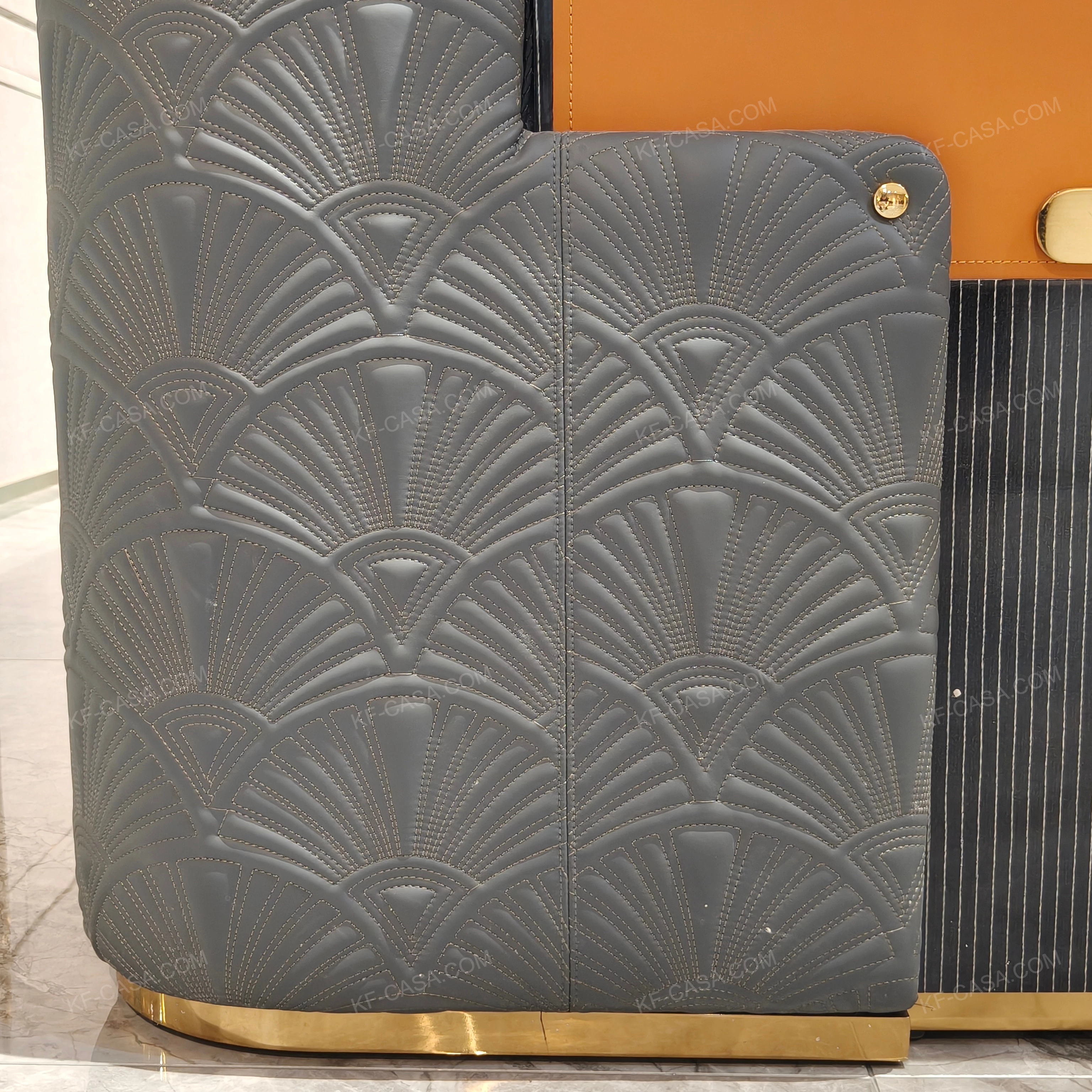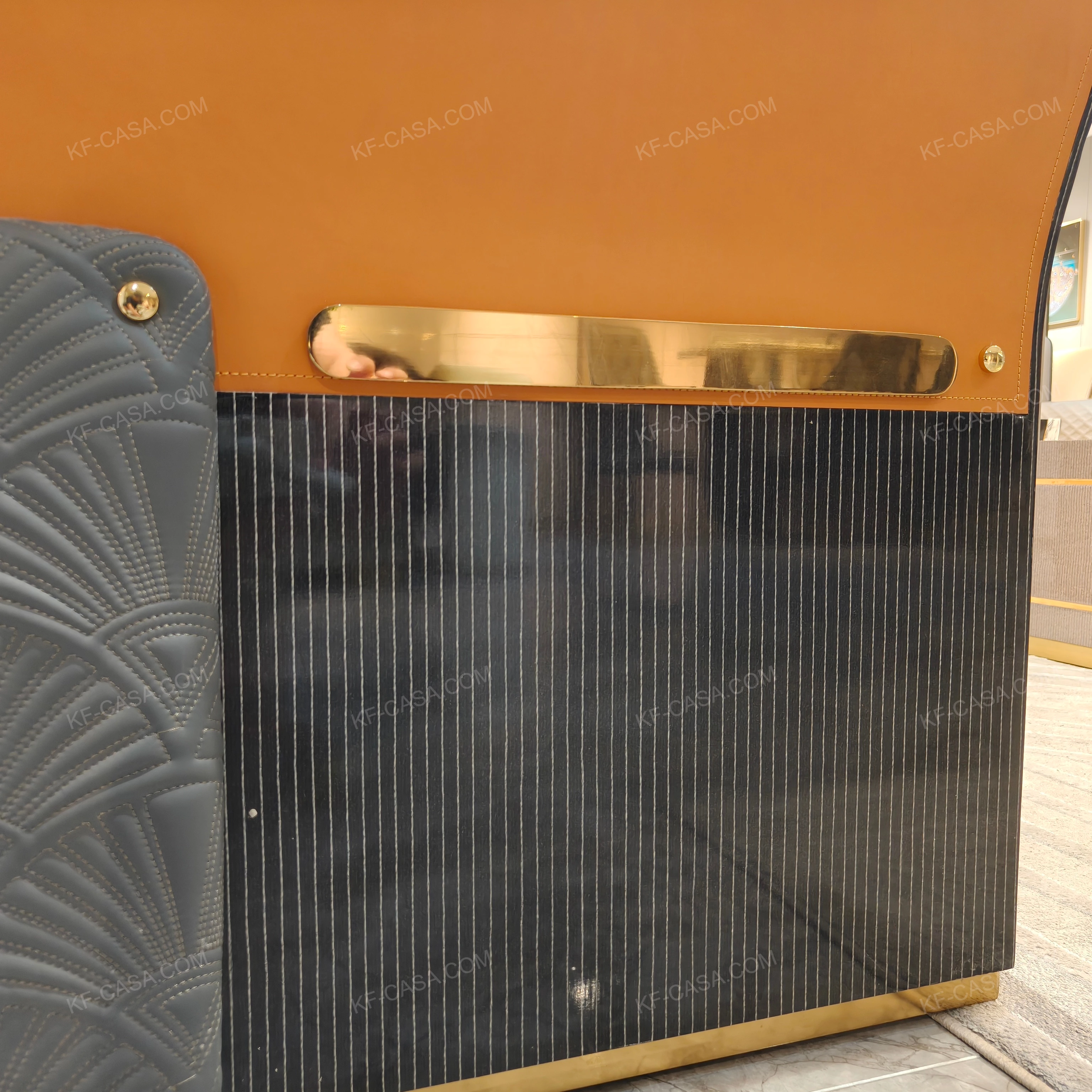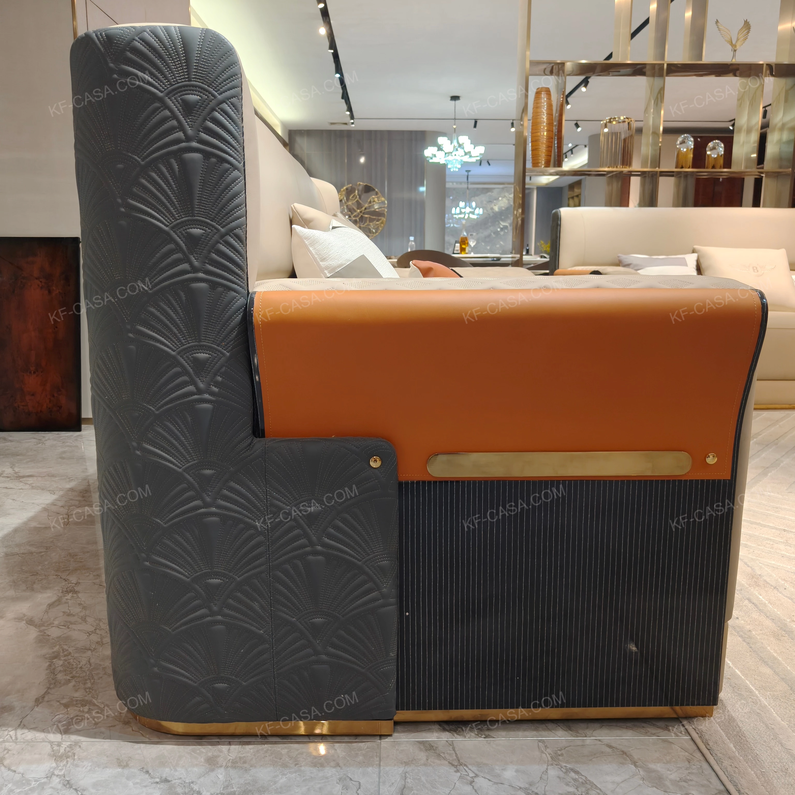 - Three-dimensional fan-shaped quilted craftsmanship on the side panels, paired with caramel color contrast veneer and vertical grain high-gloss natural wood veneer, presenting exquisite artistic details