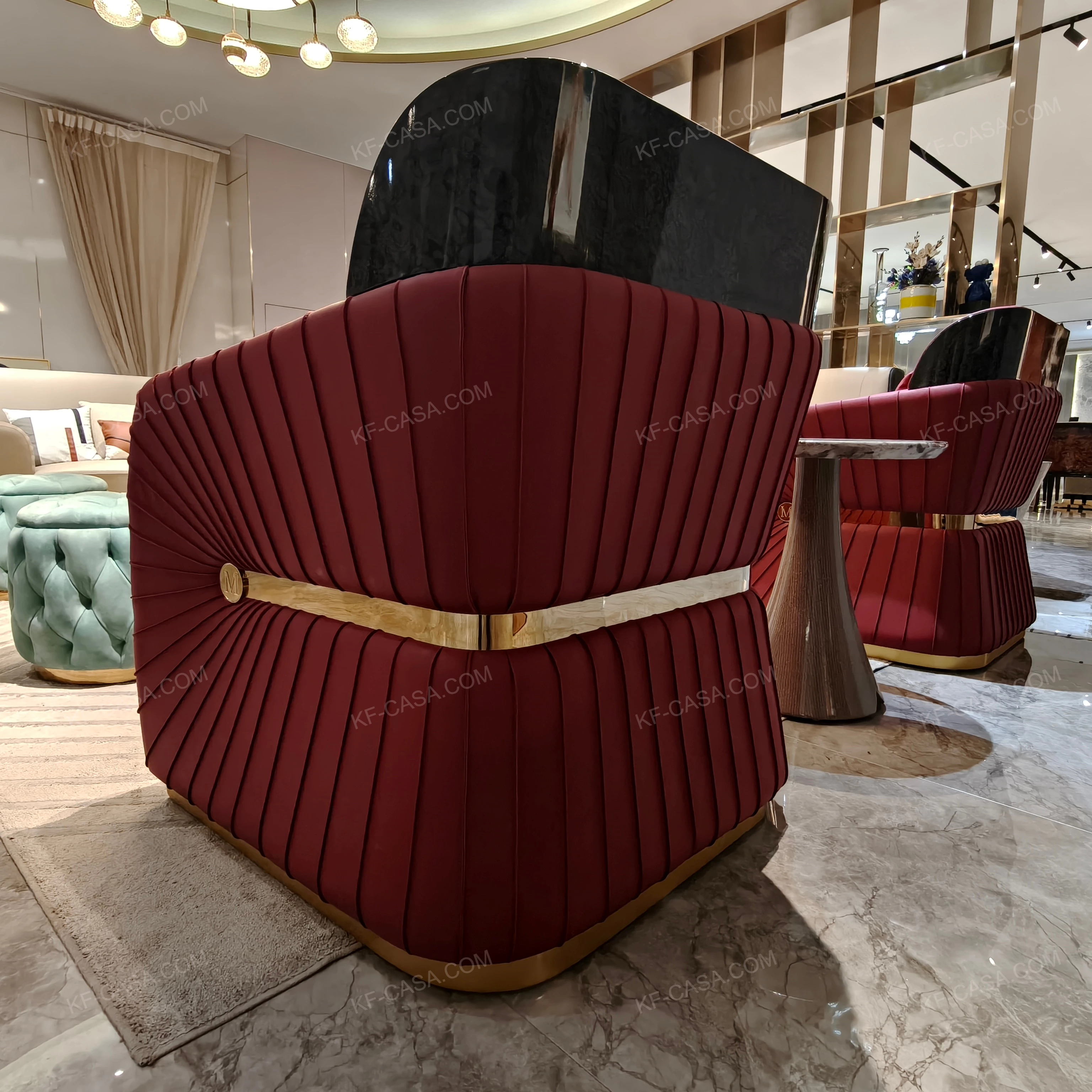 - Burgundy leisure chairs adopt radial vertical pleated craftsmanship, matched with high-gloss natural wood veneer back panels and gold stainless steel bases, combining visual impact and seating support