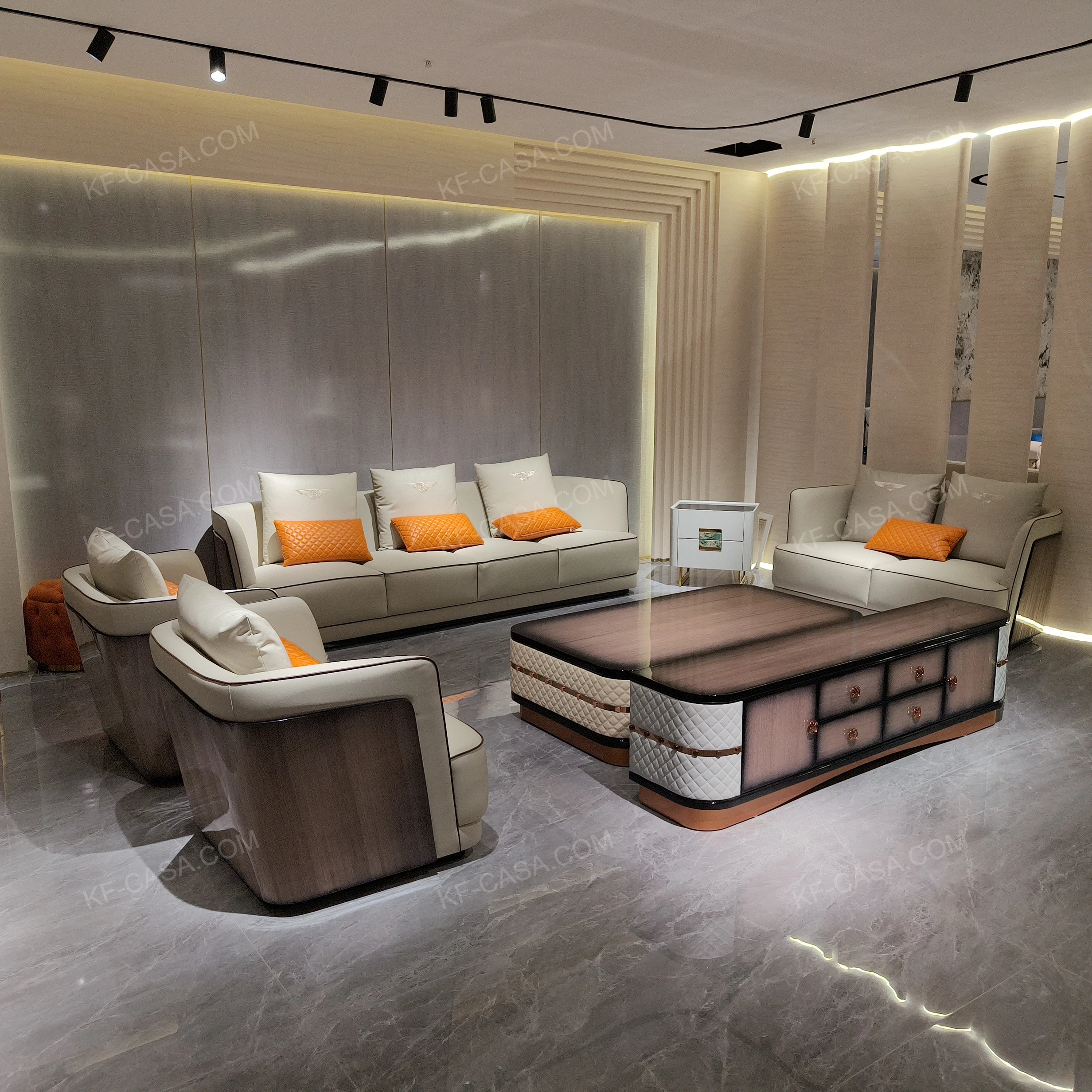Wrapped in premium dove gray leather with delicate piped edge detailing, this sofa set balances soft comfort with modern sophistication. Natural wood veneer side panels bring organic warmth, while orange diamond-quilted pillows and embroidered wing logos elevate the aesthetic with artisanal texture. Supported by a polished stainless steel base, it creates a refined, inviting seating ensemble perfect for upscale contemporary living spaces.