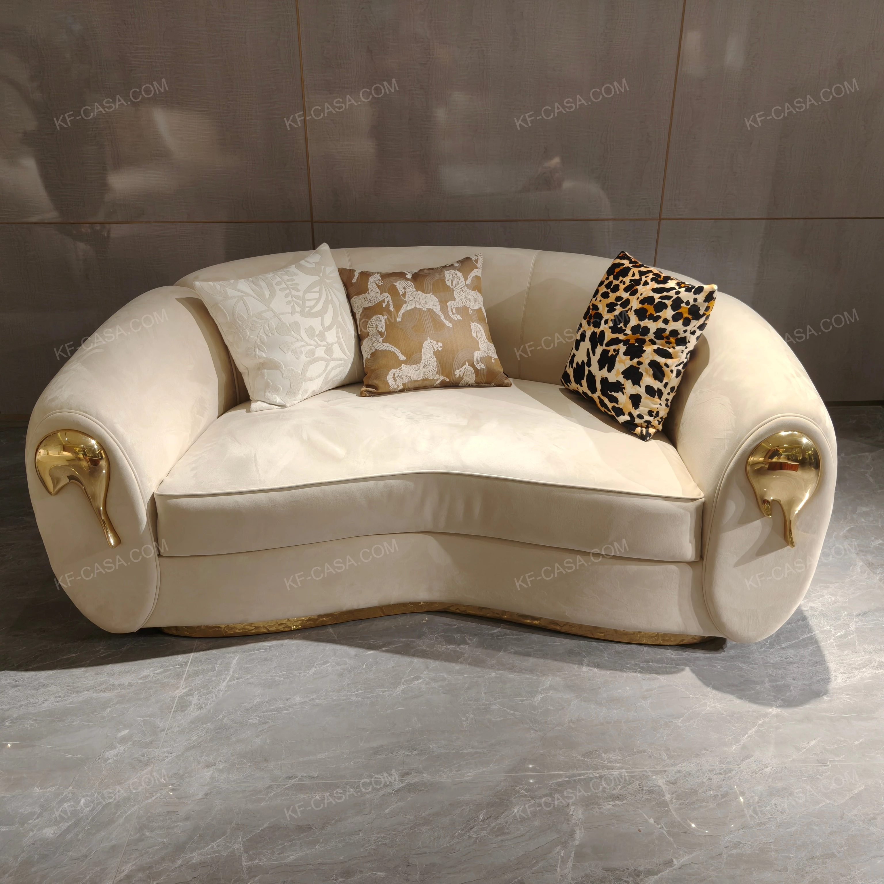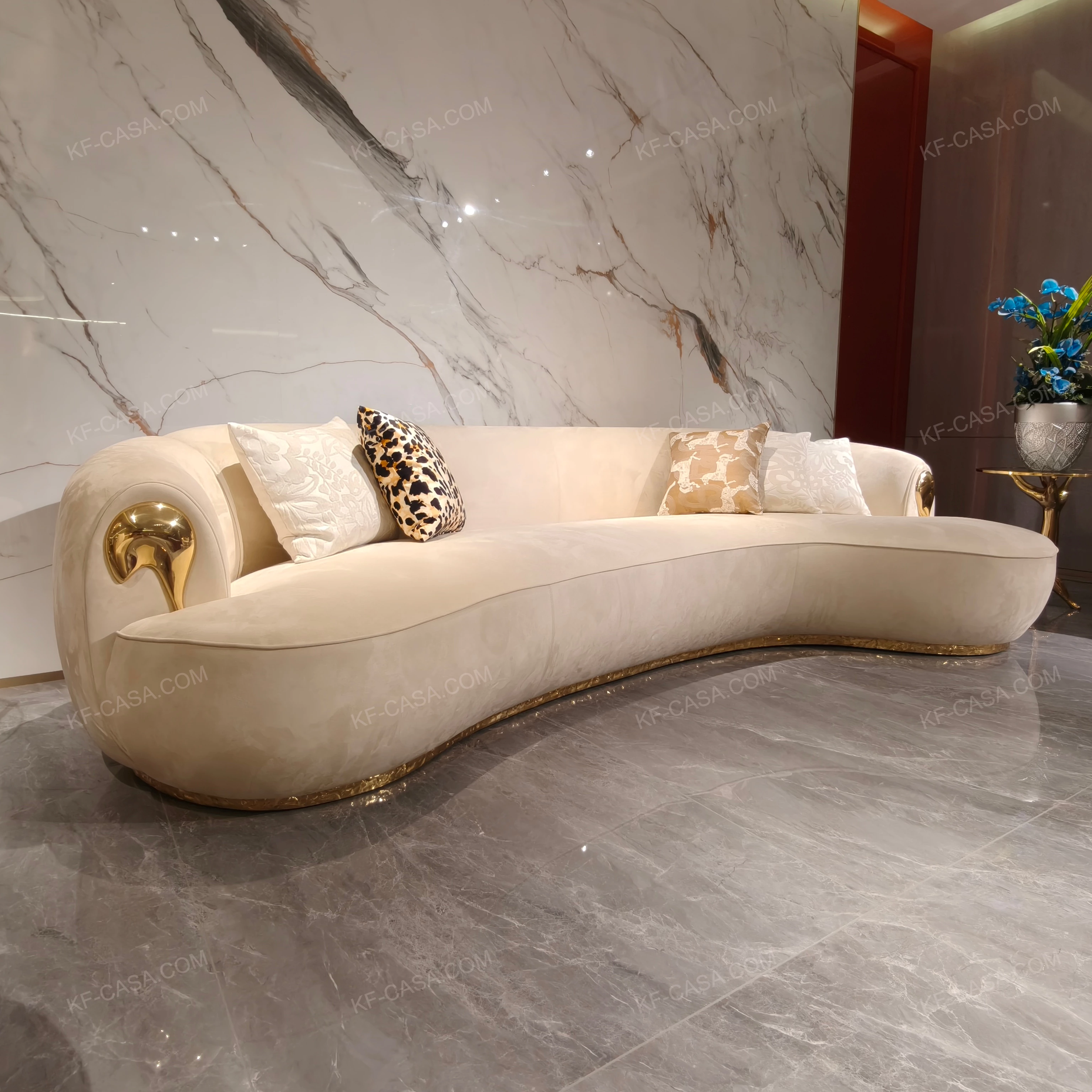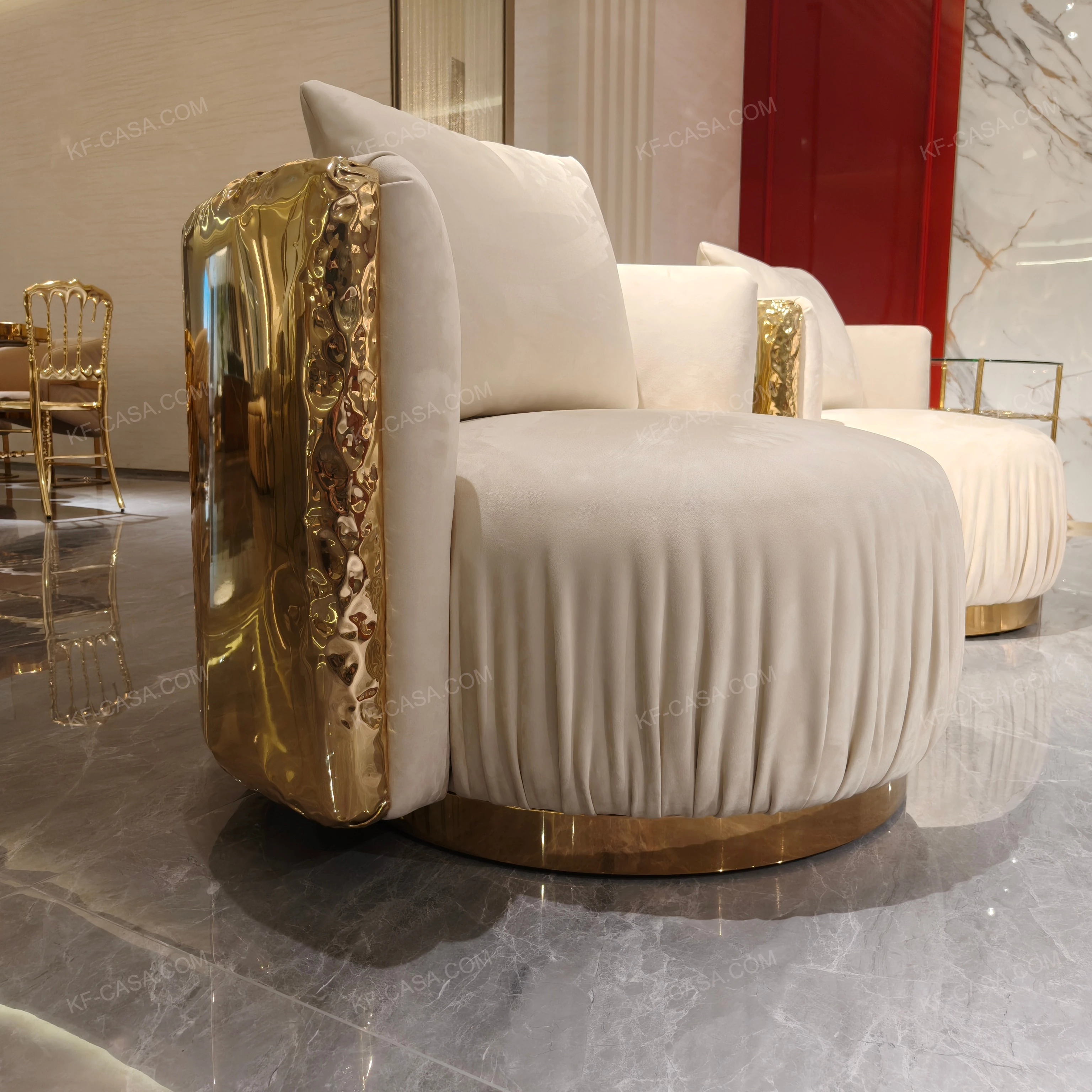 This fluid curved luxury sofa set is wrapped in premium matte suede upholstery, featuring an ergonomic curved silhouette defined by sculptural polished gold stainless steel armrest accents and a handcrafted hammered texture gold base. Artistic decorative cushions add distinctive visual vitality, while matching pleated leisure chairs form a cohesive, high-end seating solution ideal for modern luxury living spaces.