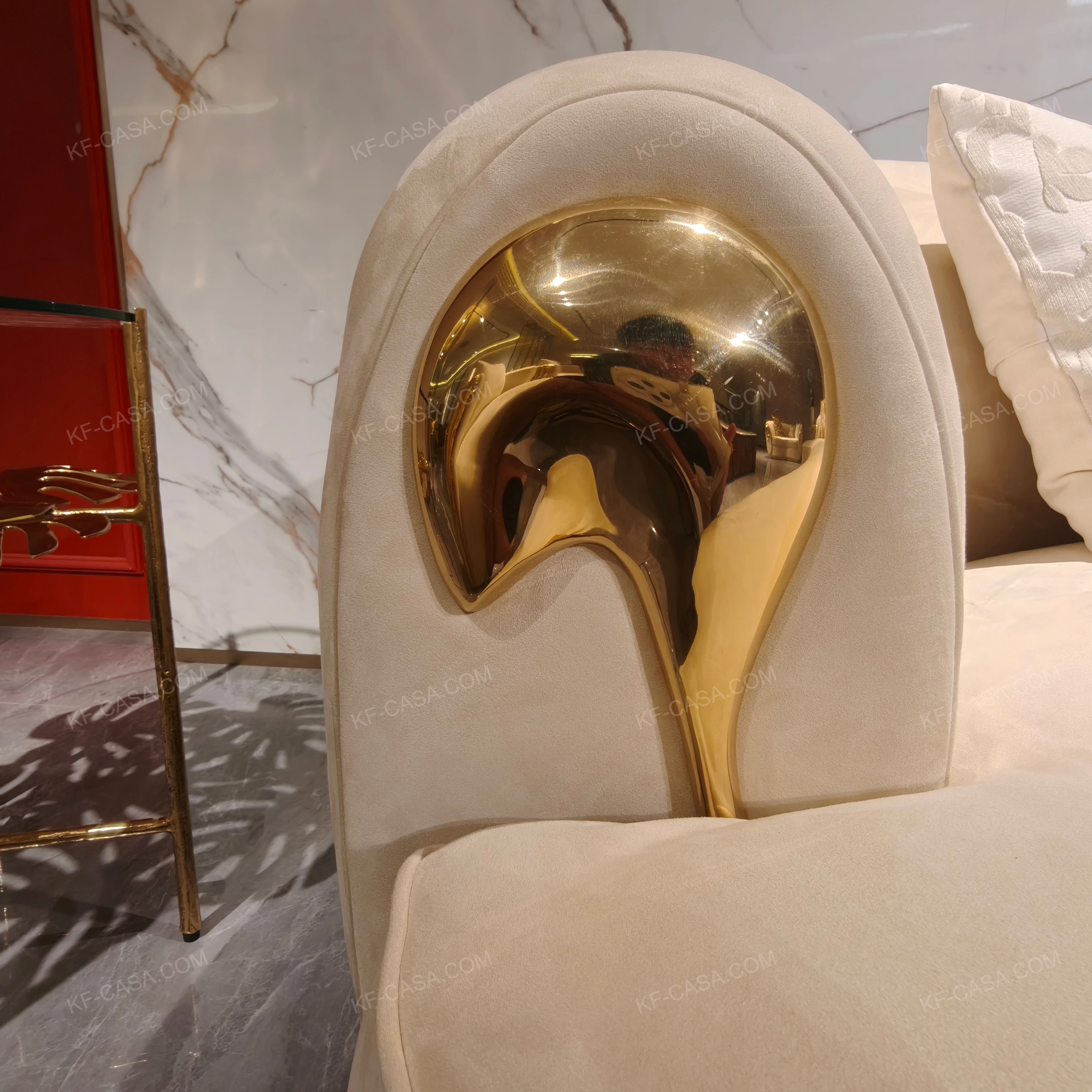 - Sculptural polished gold stainless steel decorative elements on armrests, infusing artistic charm and high-end metallic contrast