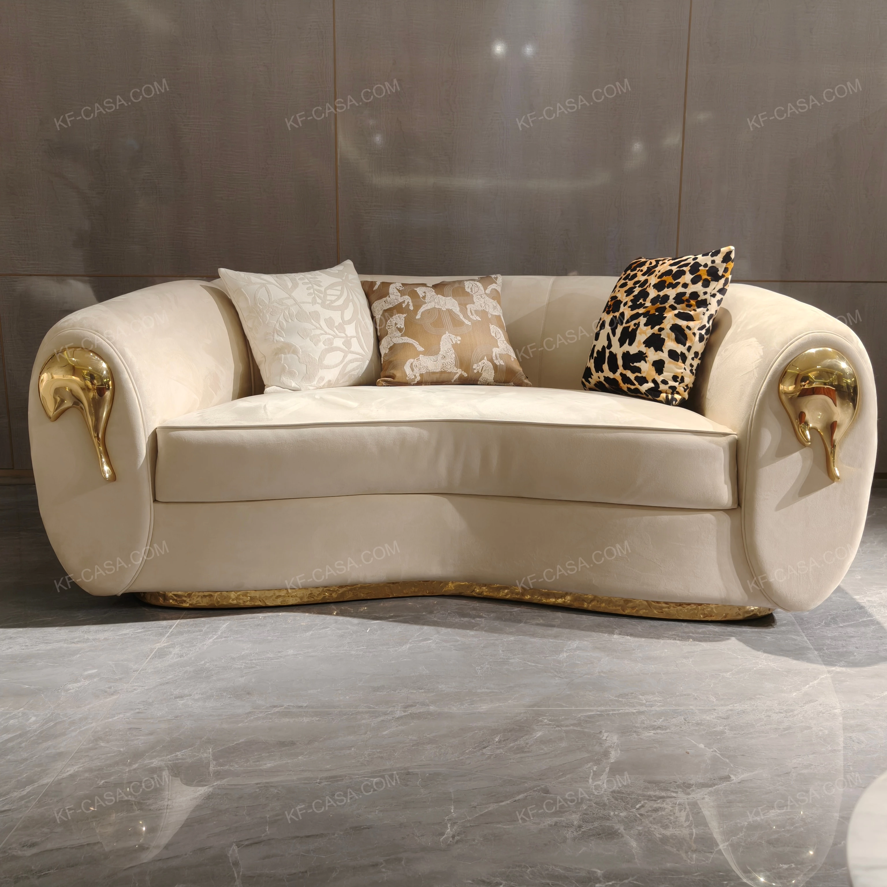 Fluid Curved Luxury Sofa Set with Sculptural Gold Stainless Steel Accents & Hammered Texture Base