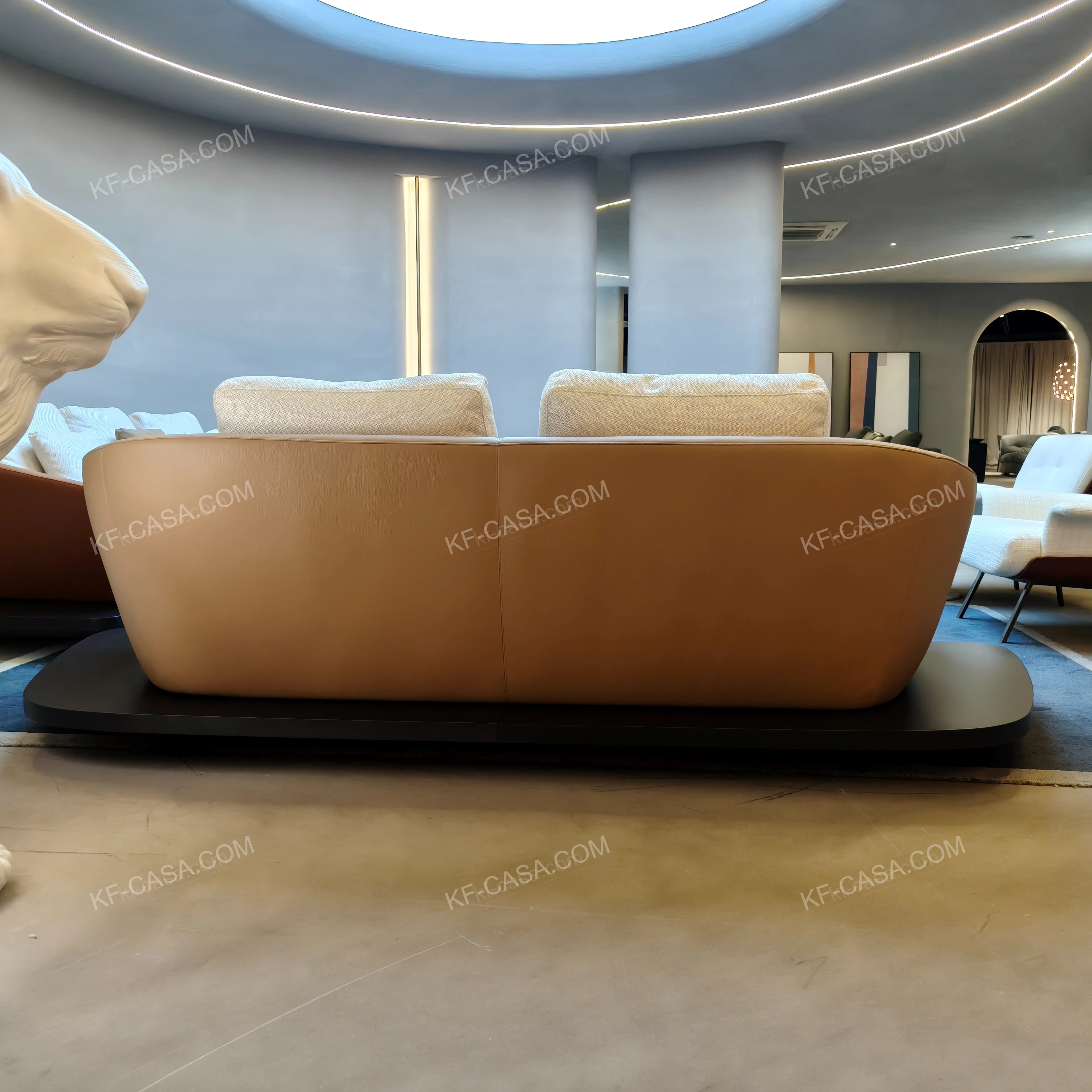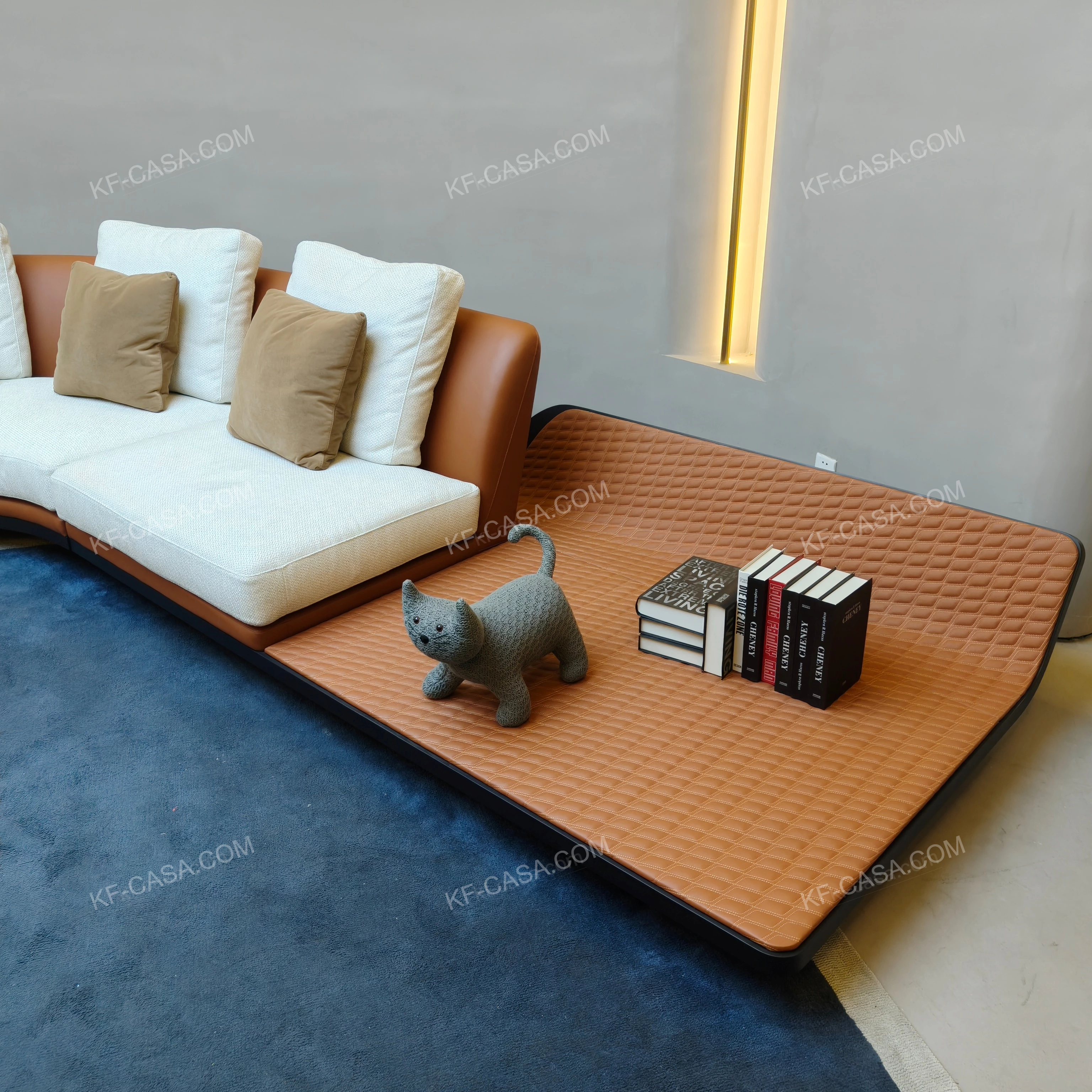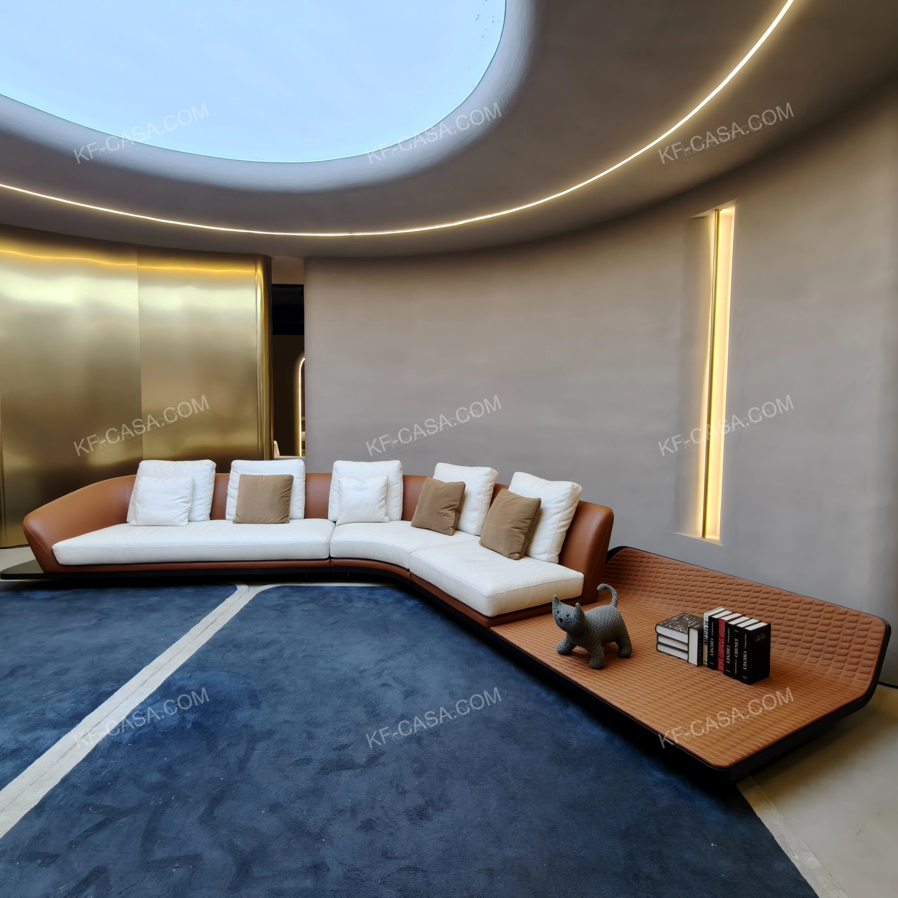 This modern curved luxury sectional sofa collection is crafted from premium leather and textured fabric, featuring a fluid curved modular design that perfectly fits large upscale villa and penthouse living spaces. It is defined by an integrated quilted leather display side table for practical daily use, and a suspended matte black base that adds sleek modern style while ensuring stable structural support. Plump high-resilience cushions deliver exceptional long-term seating comfort, complemented by matching wood-frame leisure chairs, forming a cohesive high-end seating solution for contemporary luxury home interiors.