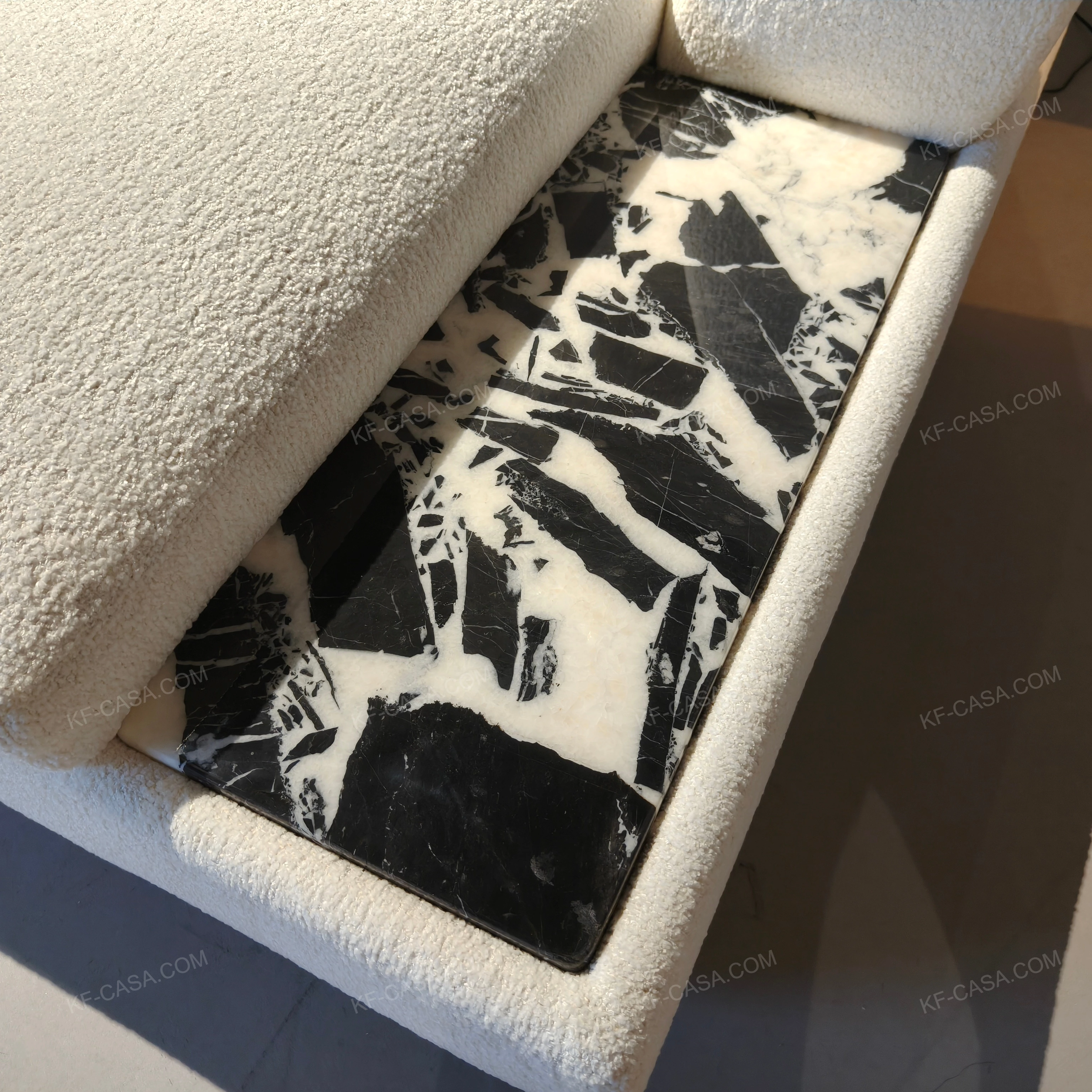 This modern L-shaped modular sectional sofa is crafted from premium textured boucle fabric, defined by its soft rounded wide armrests and inset natural marble side tables that add practical daily functionality while elevating the overall sophisticated design. Its flexible L-shaped modular structure adapts perfectly to diverse living space layouts, from urban apartments to large villa living rooms. Plump high-resilience cushions deliver exceptional long-term seating comfort, while the sleek suspended metal base ensures stable structural performance and a modern floating aesthetic, making it an ideal centerpiece for contemporary minimalist and luxury home interiors.