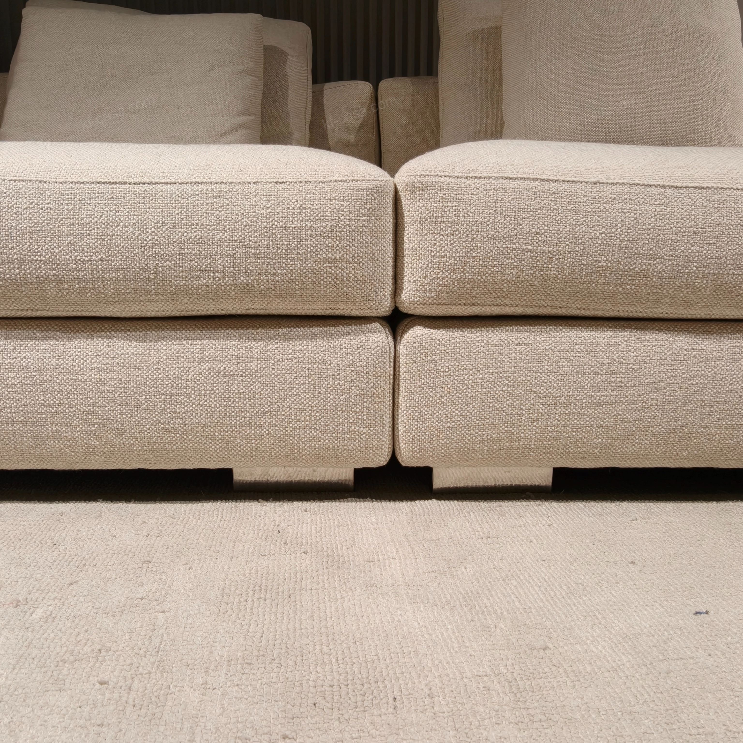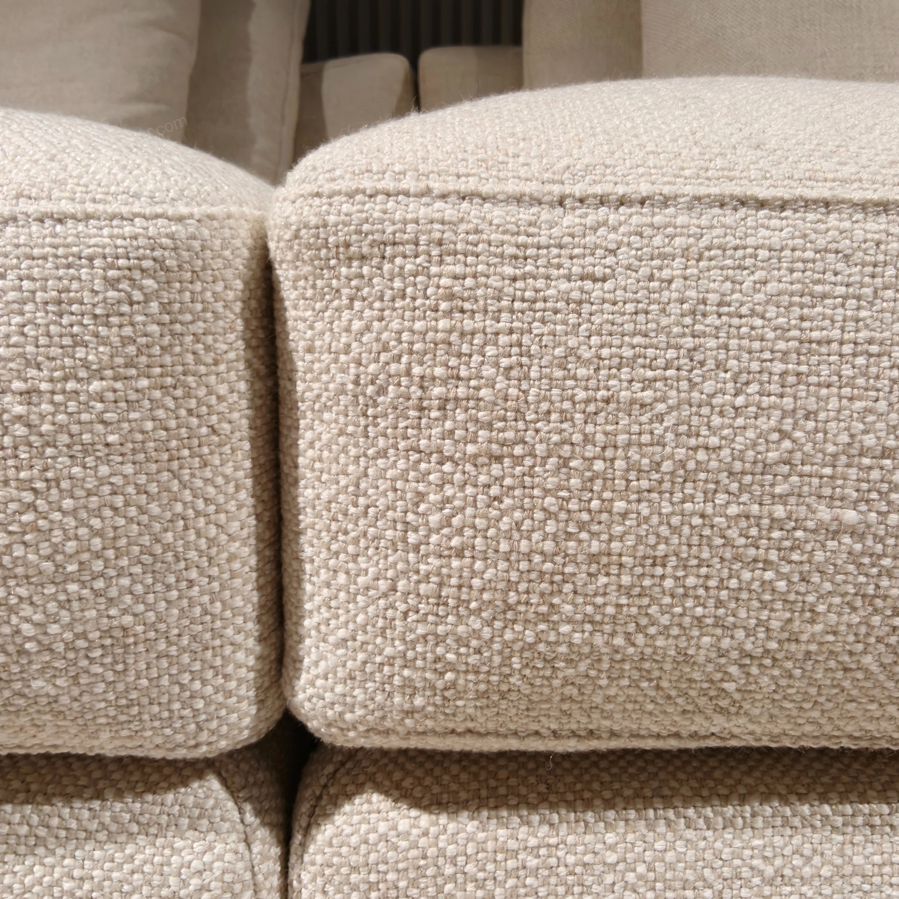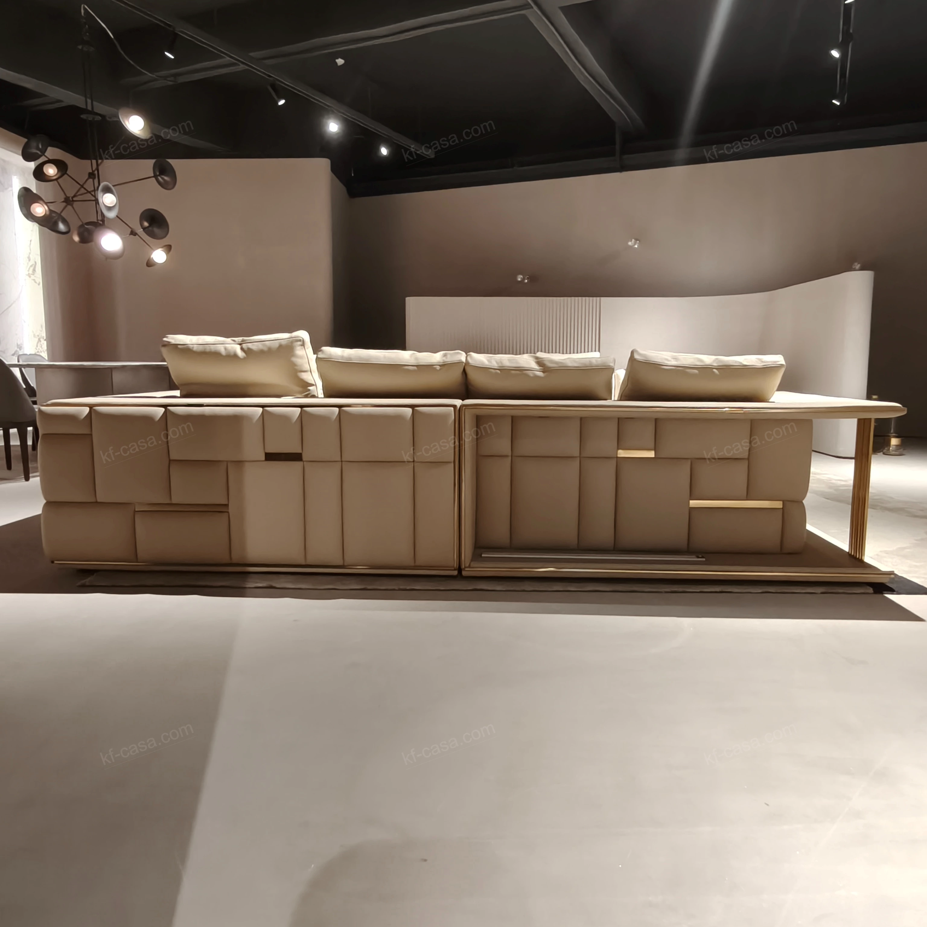 This modern L-shaped modular sectional sofa is crafted from premium textured linen-blend fabric, defined by exquisite handwoven leather side panels and grid tufted craftsmanship with refined metal decorative details. Its flexible modular structure adapts perfectly to large villa and penthouse living spaces, while plump down-filled back cushions and high-resilience seat cushions deliver exceptional long-term seating comfort. The polished metal base ensures stable structural performance while adding a sleek modern touch, making it an ideal centerpiece for contemporary luxury home interiors.