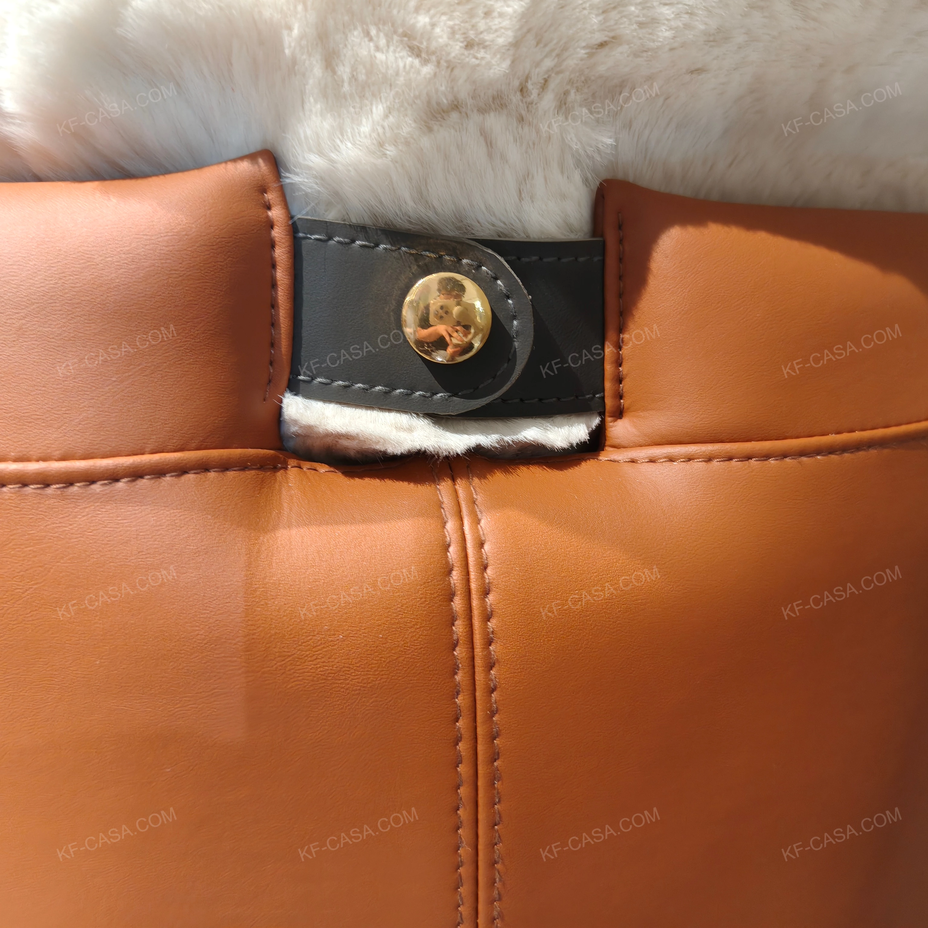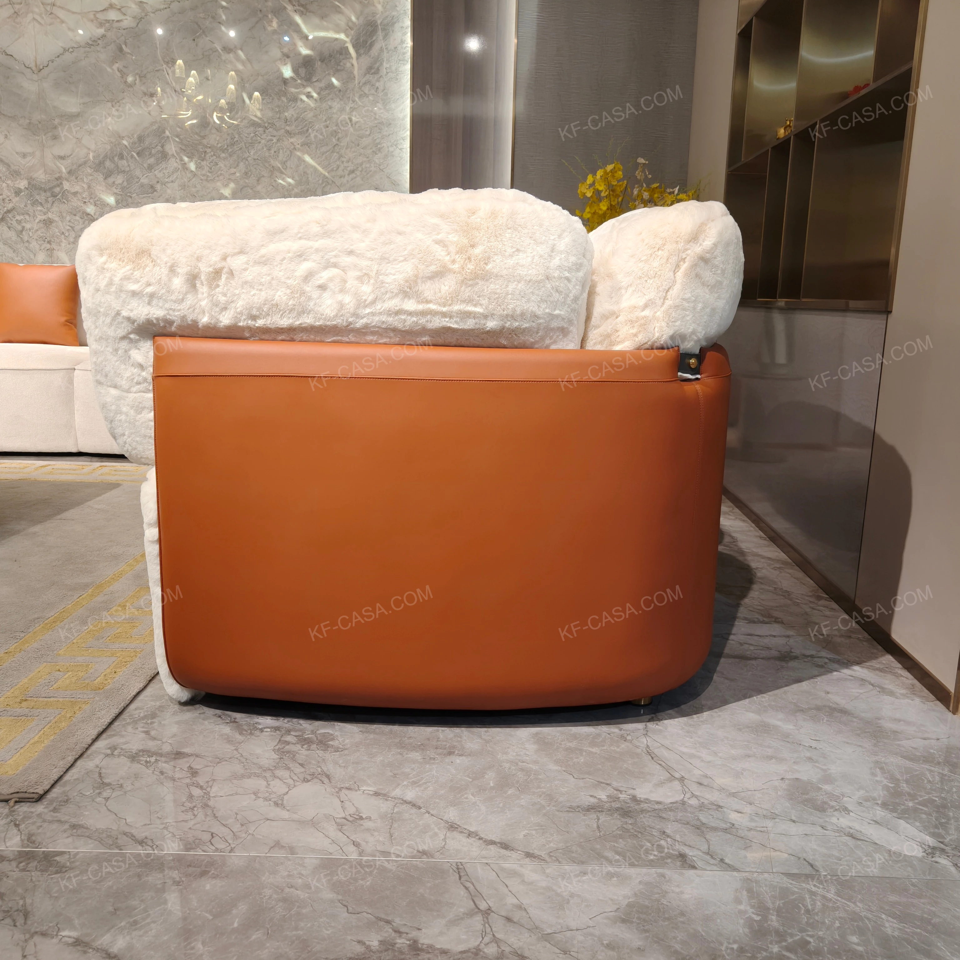 - Premium white plush fabric paired with smooth orange leather panels, offering a soft, cozy tactile experience